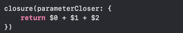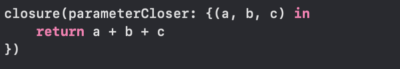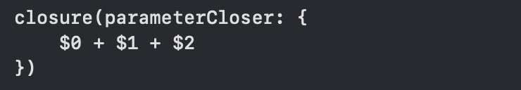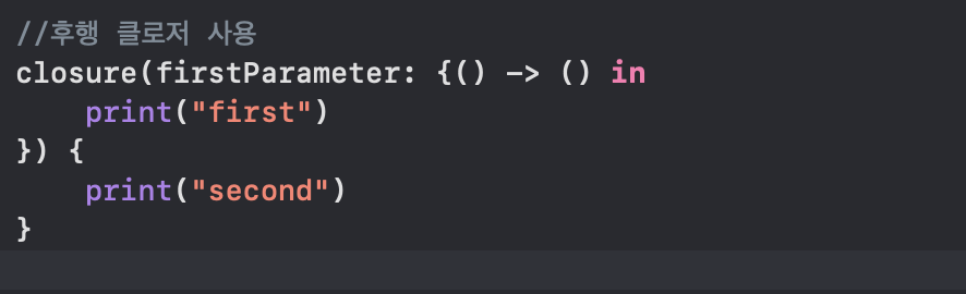 후행 클로저를 사용할 수 있는 마지막 매개변수에는 호출 구문 소괄호에서 벗어나 꼬리처럼 클로저를 할당해준다.