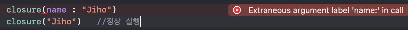클로저에서는 Argument Label은 사용되지 않기 때문에 다음과 같이 사용했을 때 오류가 발생한다.