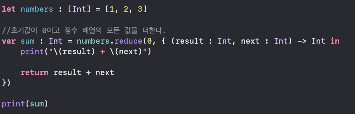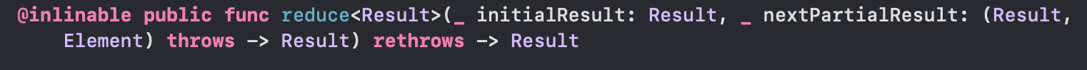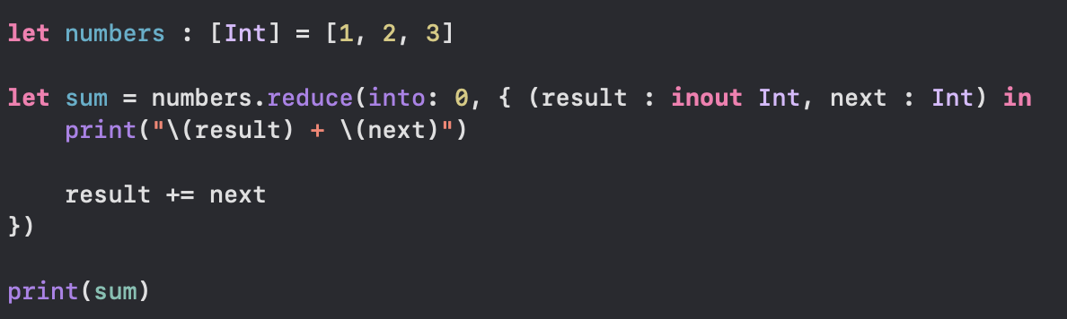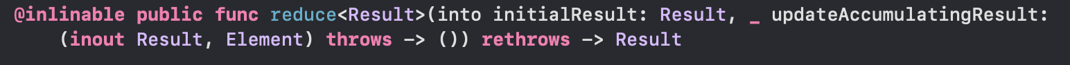 결과 타입이 참조 타입이거나 큰 값 타입(사이즈가 큰 배열이나 사전 등)인 경우에는 이 형태의 리듀스를 사용하는 것이 더 효율적일 수 있다.