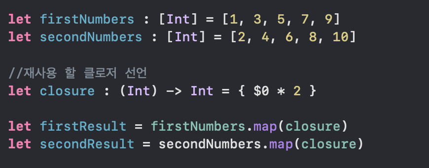 클로저를 인자로 사용하고, 원래 배열의 각 요소에 해당 클로저 구현부를 적용한 결과를 반환해줌.