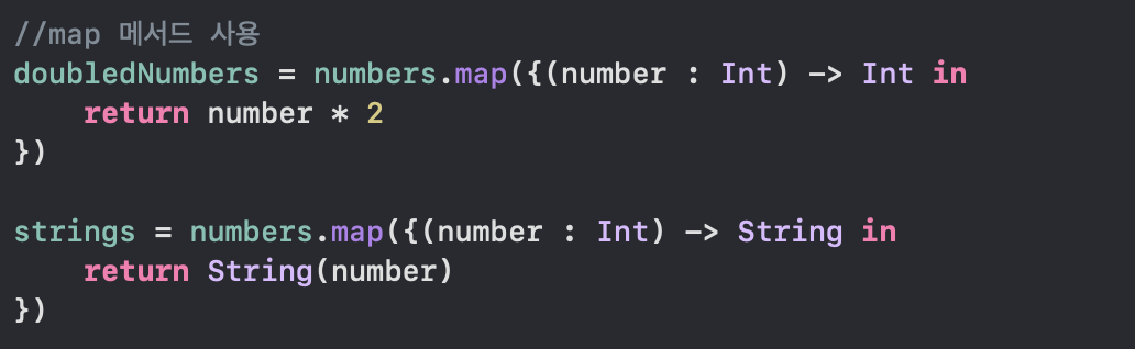 정리해보면, map은 기존 컨테이너 요소를 매개변수로 받아들이고, 정의한 클로저에 맞게 변환된 값을 반환해준다.