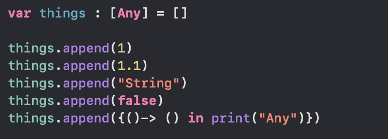 Any를 사용하면 위의 코드처럼 모든 타입의 인스턴스를 나타낼 수 있음.