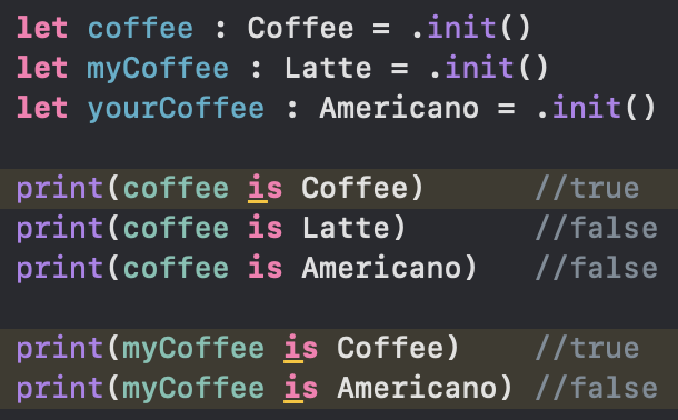 myCoffee 상수는 Coffee 인스턴스를 참조하도록 선언했지만, 실제로는 Coffee 타입 행세를 하는 Latte 타입의 인스턴스를 참조하고 있다.