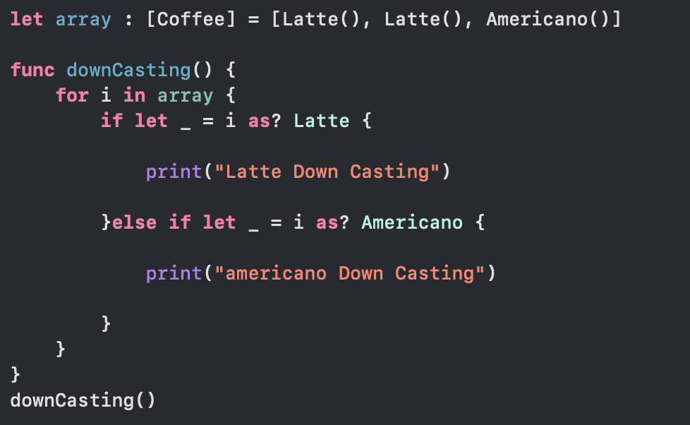 해당 요소가 Americano로 다운캐스팅이 가능하면 "americano Down Casting"을 실행해준다.