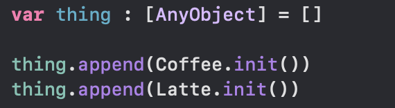 let array : [Coffee] = [Latte(), Latte(), Americano()] 이 코드를 볼 수 있었다.