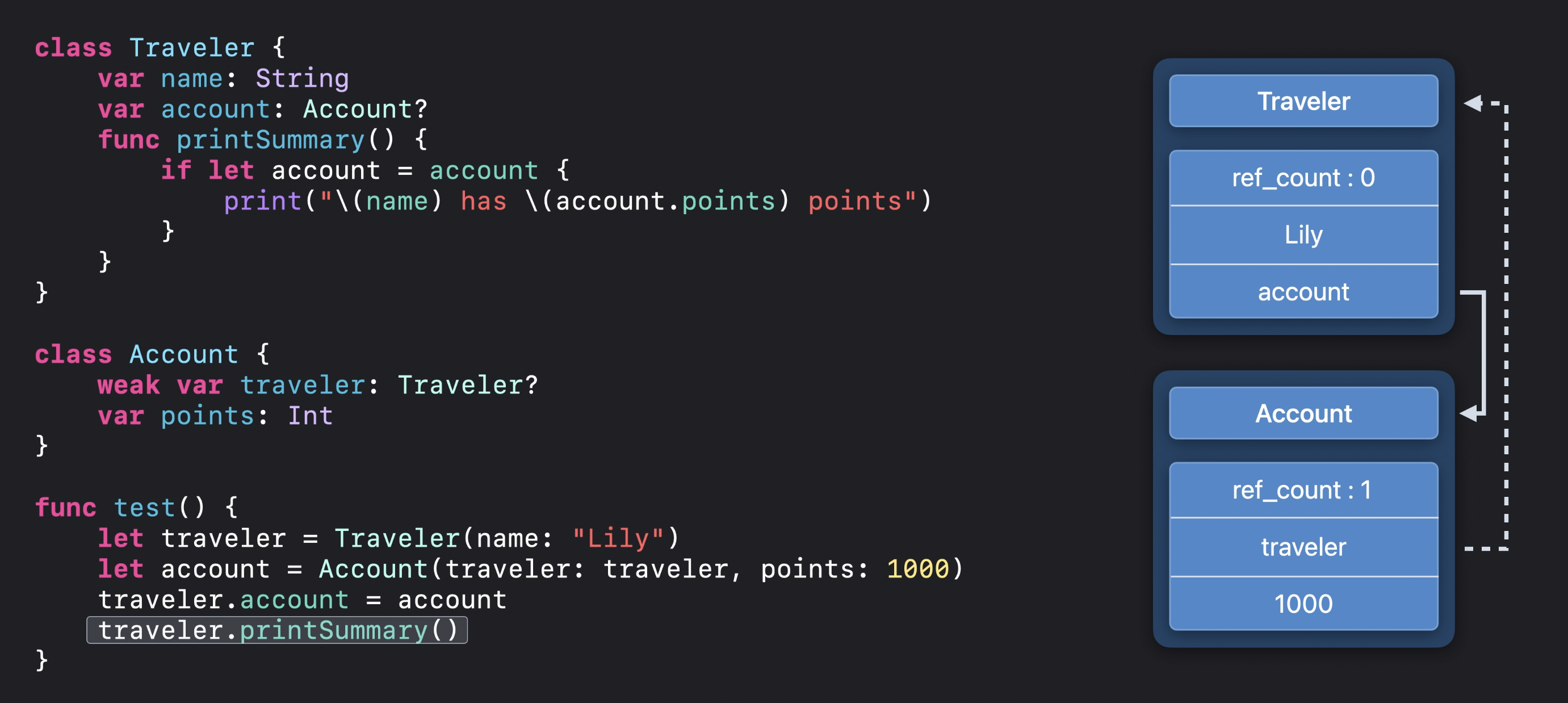마지막 사용 이후 'Traveler' 객체의 참조 카운트는 컴파일러의 'release' 에 의해 참조 카운트가 0으로 떨어진다.