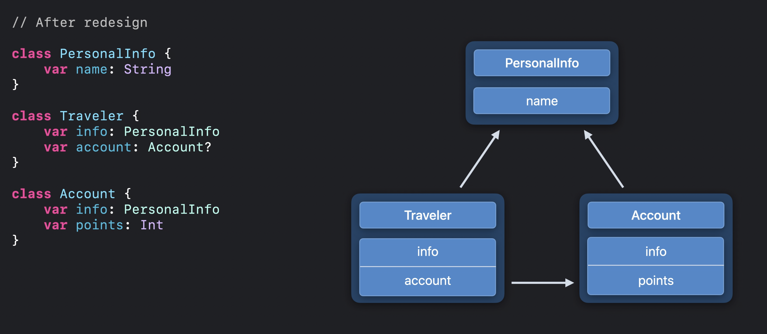 'Traveler' 클래스와 'Account' 클래스 모두 'PersonalInfo' 클래스를 참조할 수 있게 되면서 순환참조를 피할 수 있다.