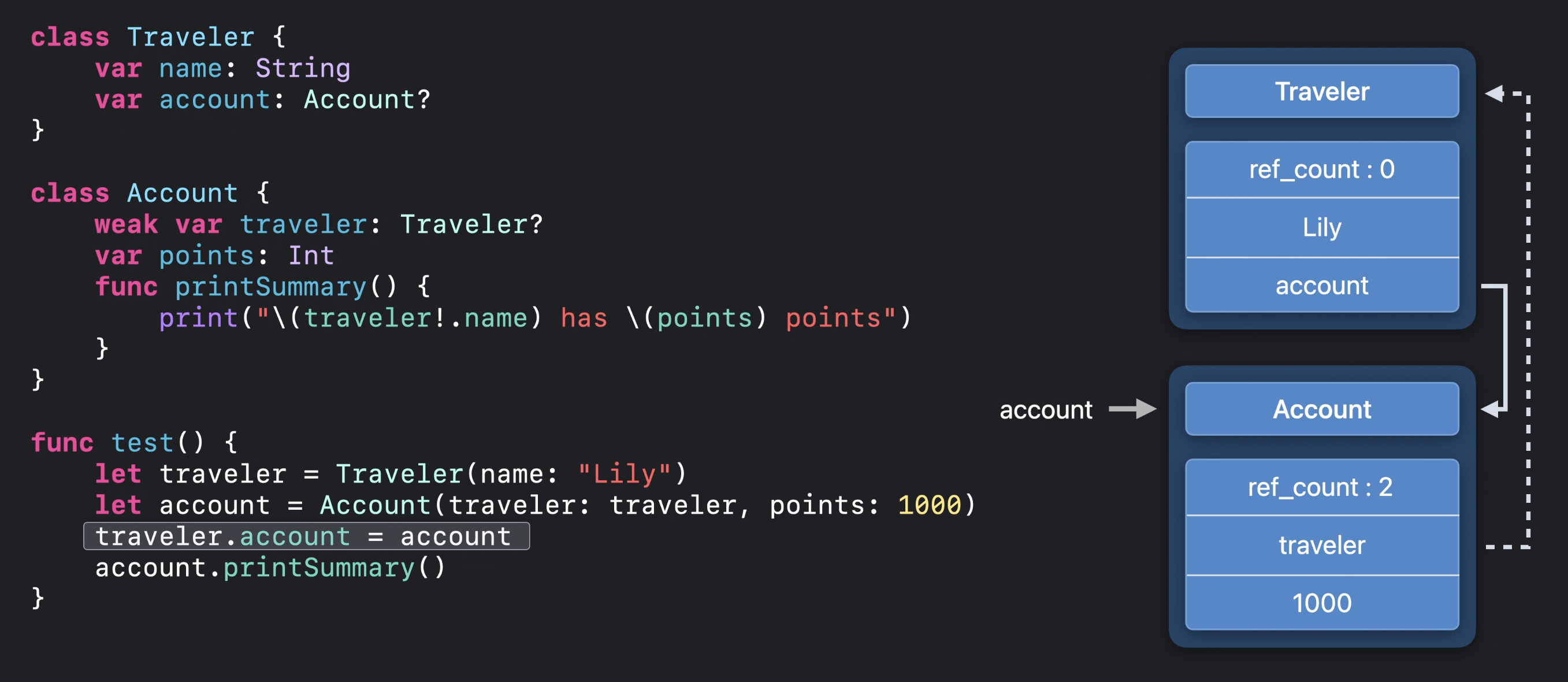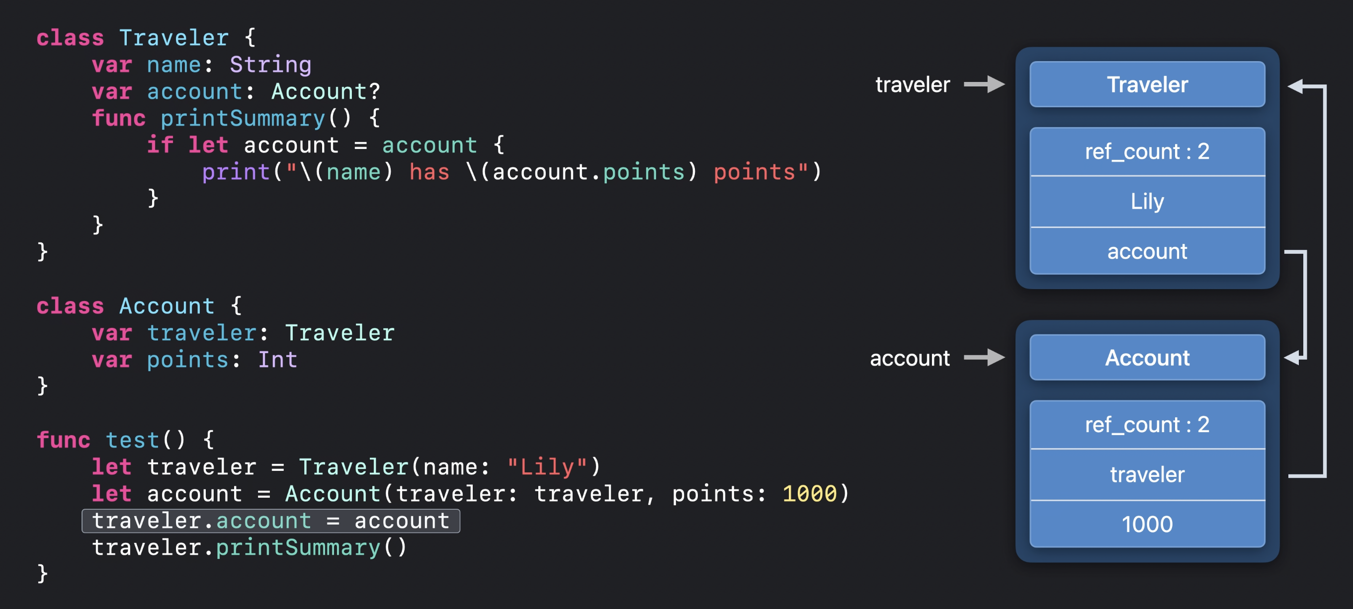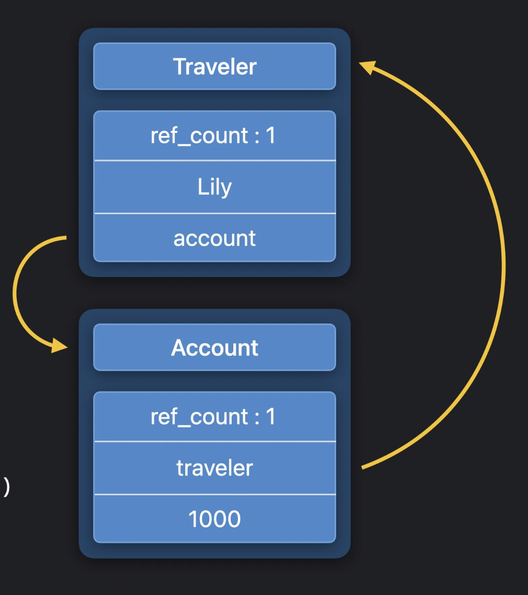 동시에, 'Account' 객체는 'Traveler' 객체를 참조하기 때문에 'Traveler' 객체의 참조 카운트가 +1 된다.