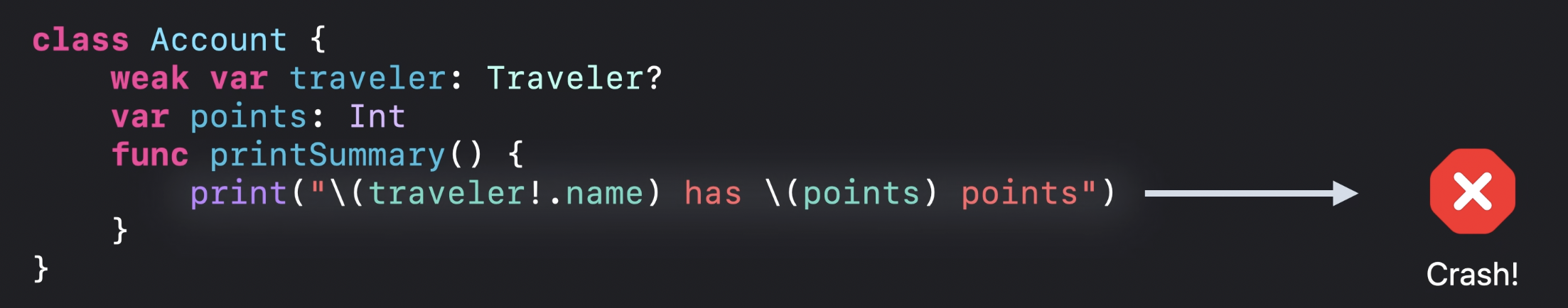 그래서 printSummary() 가 호출되면서, 'traveler' reference의 강제 언래핑을 해제하면 크래쉬가 발생한다.