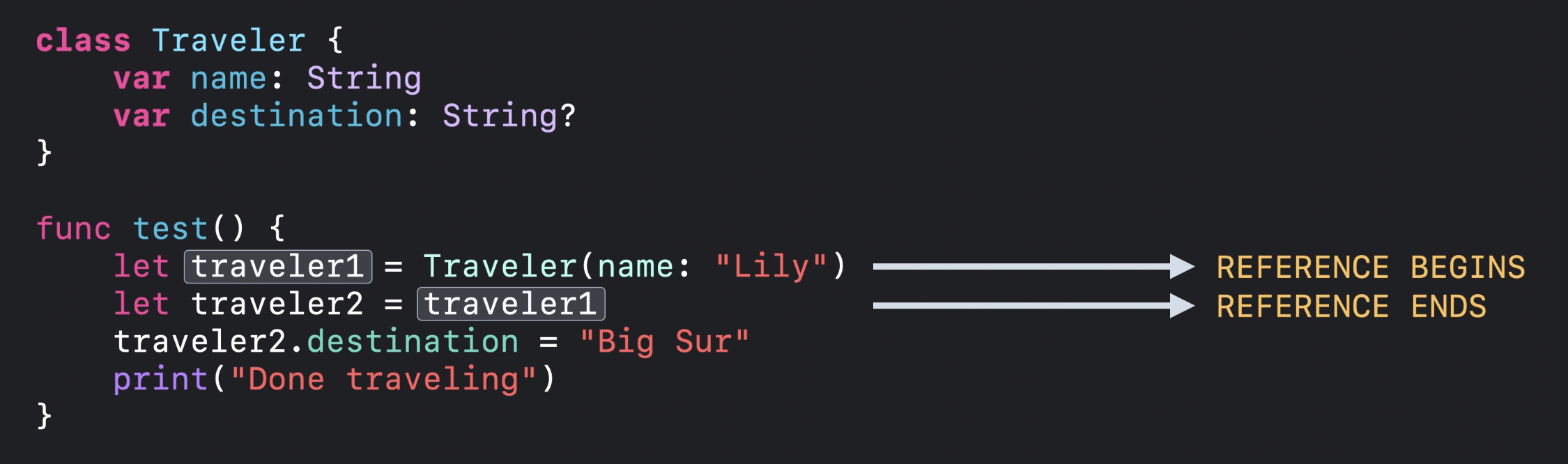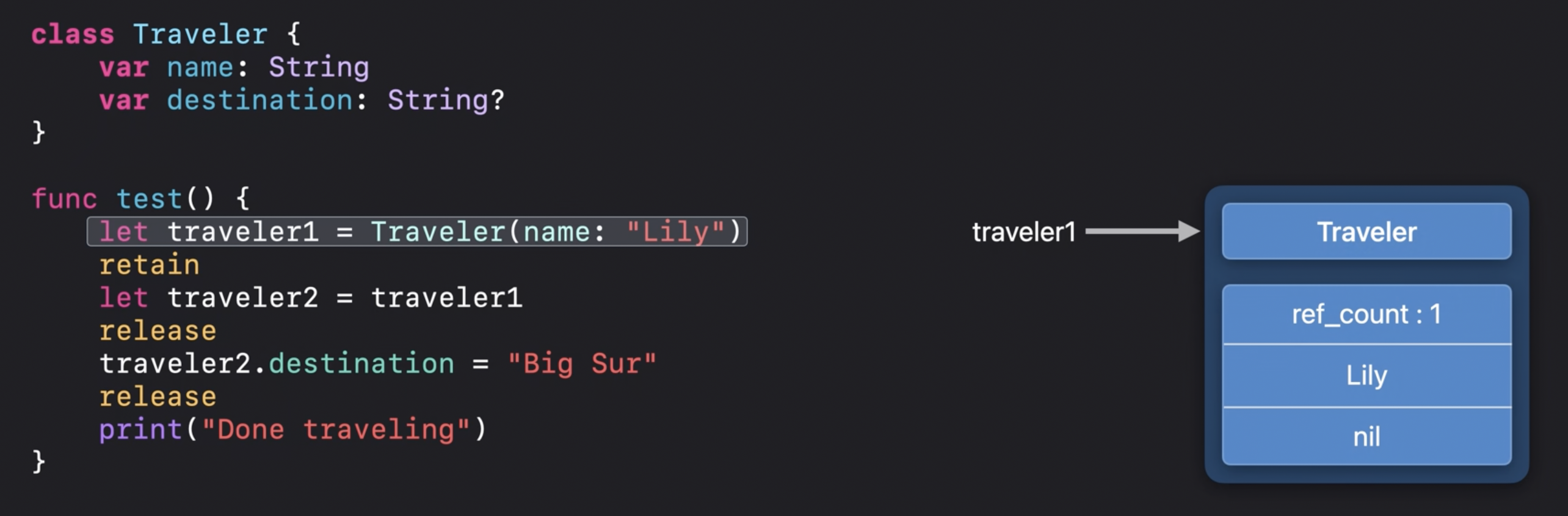 컴파일러는 'traveler1' reference 가 마지막 사용되는 즉시, 'release' 오퍼레이션을 주입한다.