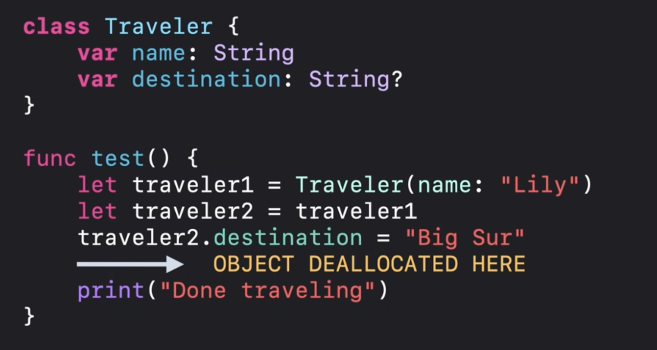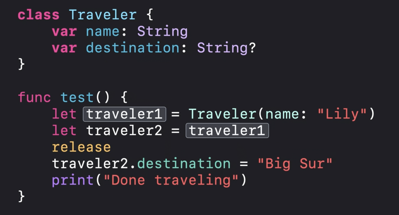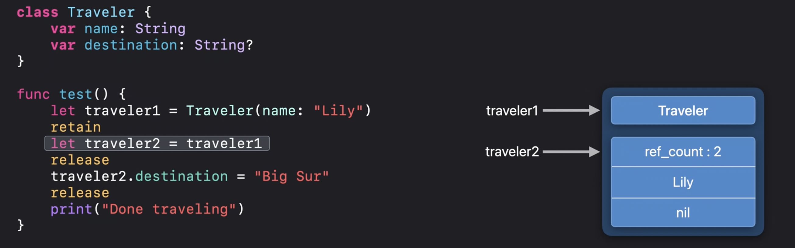 다음은 Traveler' 객체의 'destination' 이 "Big Sur" 로 업데이트 된다. 이 코드는 'traveler2' reference의 마지막 사용이기 때문에 'release' 오퍼레이션이 실행된다. (참조 카운트 = 0)