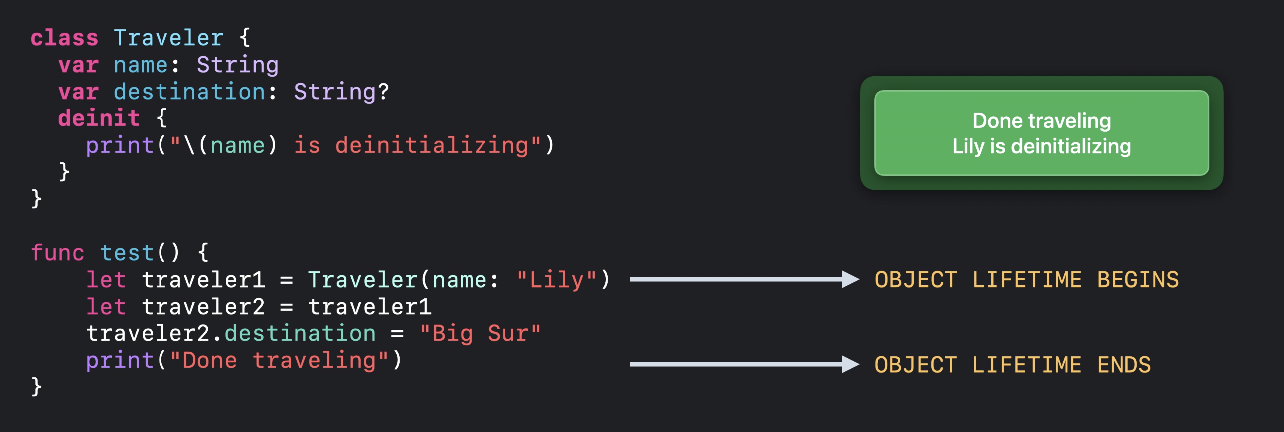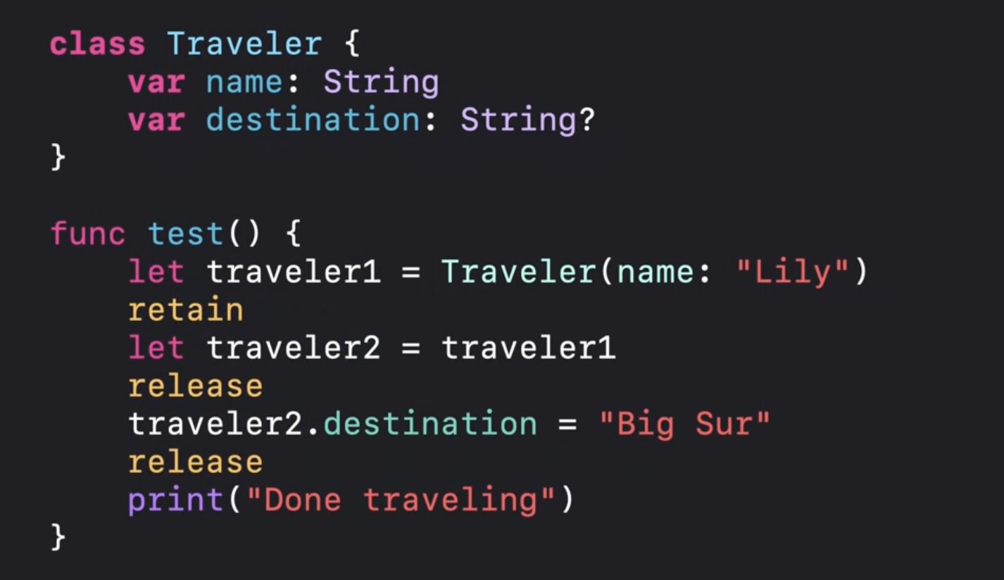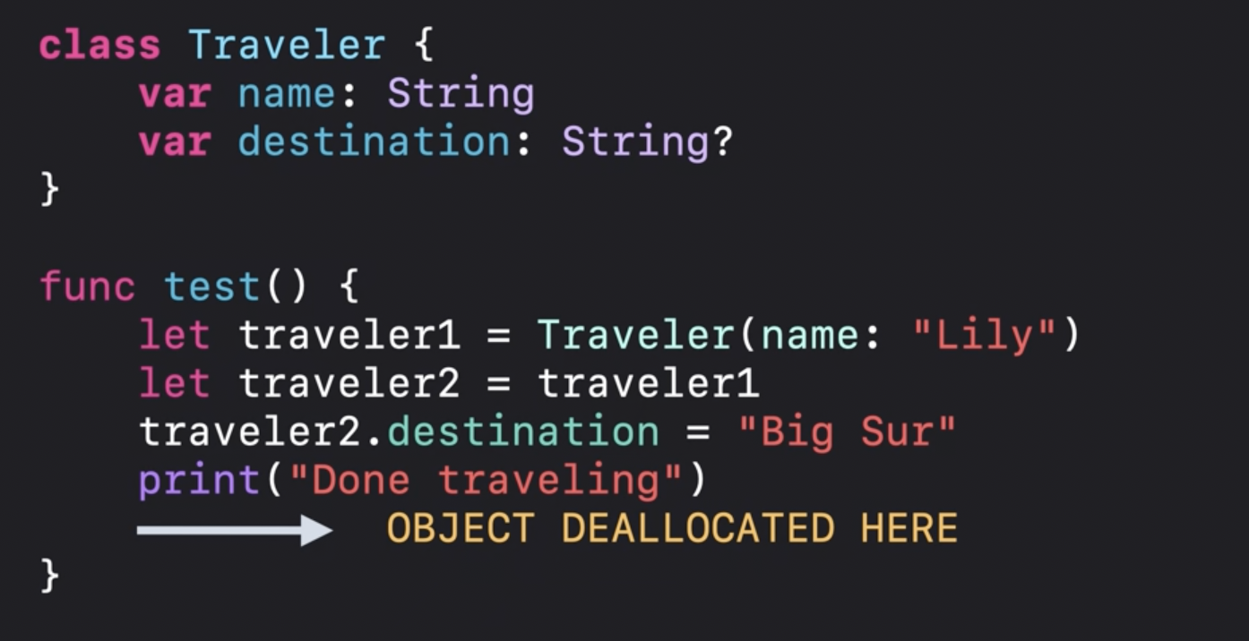 다음은 Traveler' 객체의 'destination' 이 "Big Sur" 로 업데이트 된다. 이 코드는 'traveler2' reference의 마지막 사용이기 때문에 'release' 오퍼레이션이 실행된다. (참조 카운트 = 0)