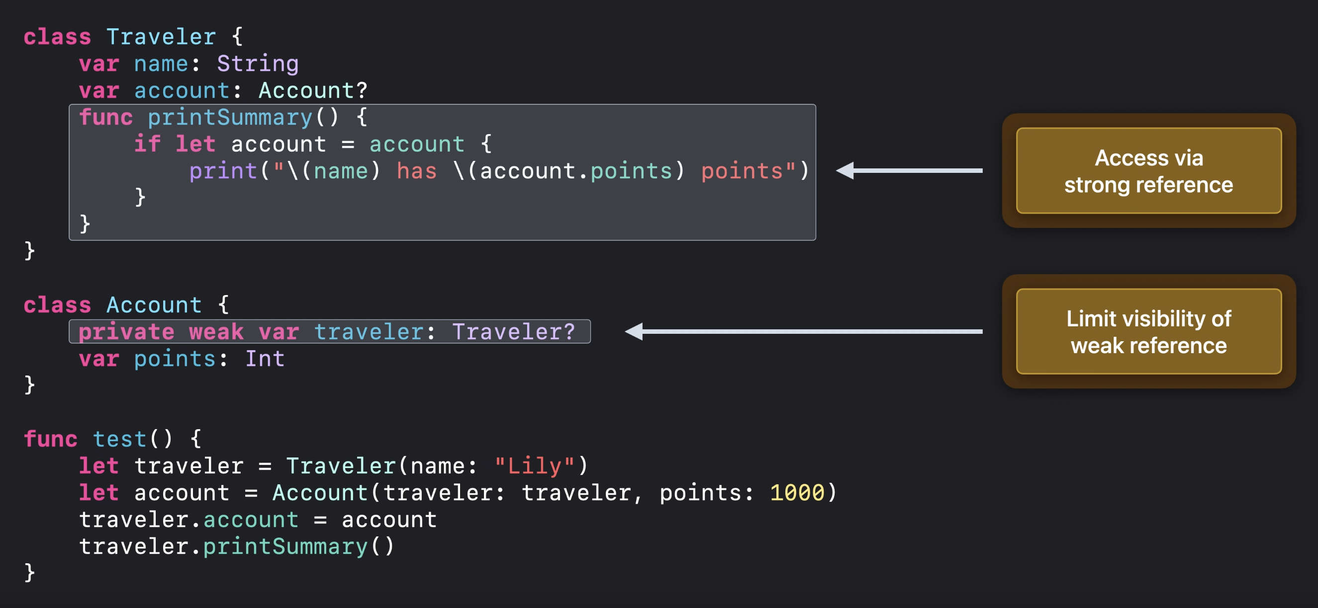 객체의 접근을 'strong' 참조로 제한하는 경우, 객체 수명에 대한 놀라움을 방지할 수 있다.