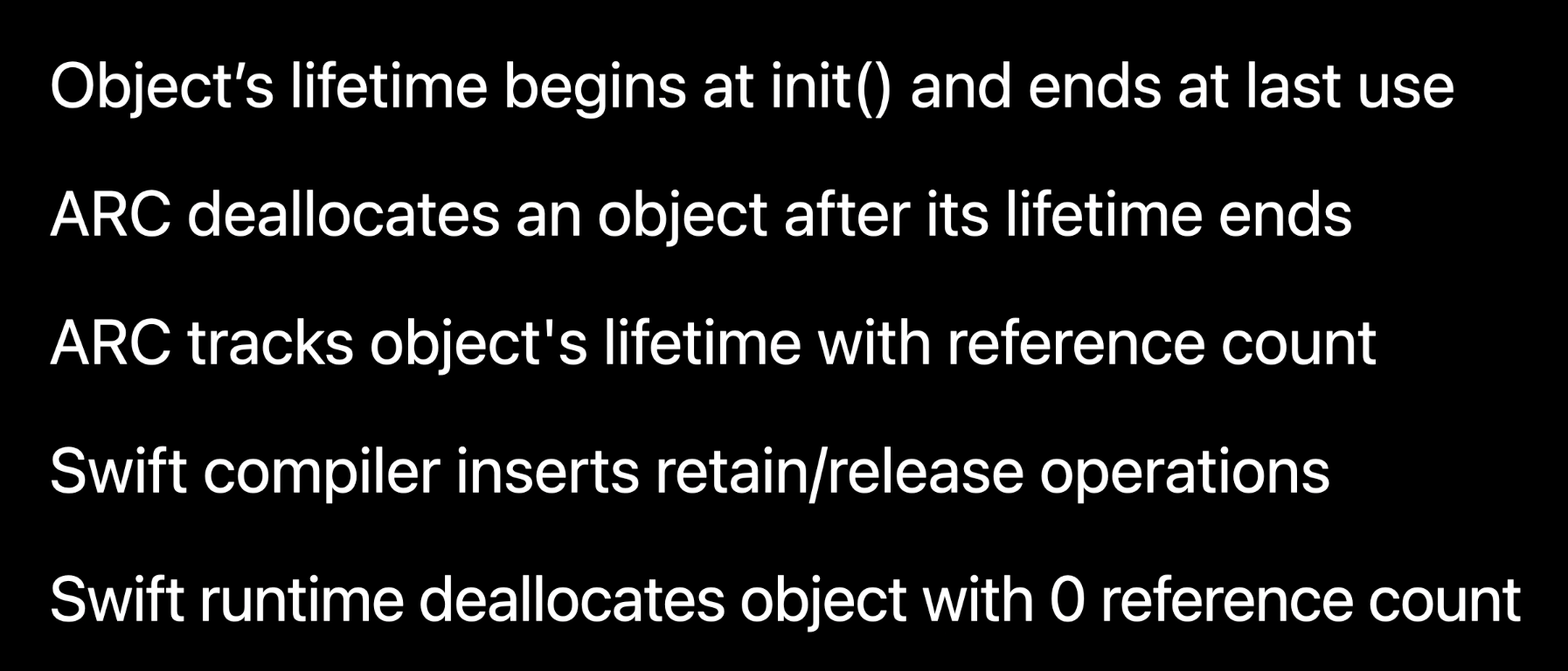 - Swift의 런타임에 'retain' 은 참조 카운트를 증가시키고, 'release' 는 참조 카운트를 감소시킨다. 참조 카운트가 0이 되면 객체는 메모리에서 할당 해제된다.