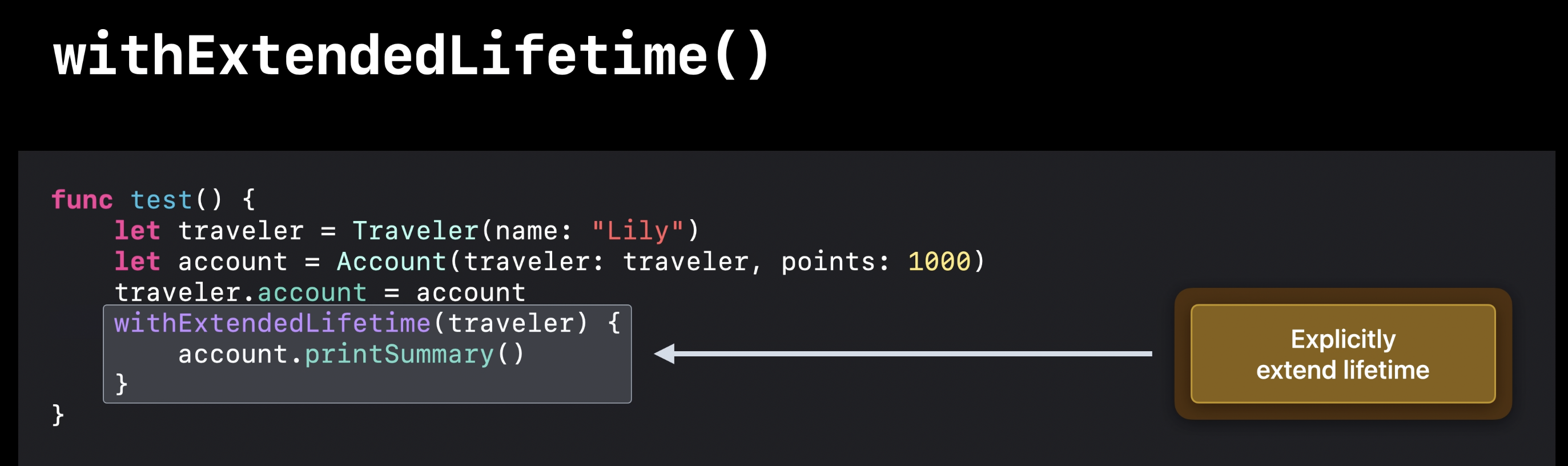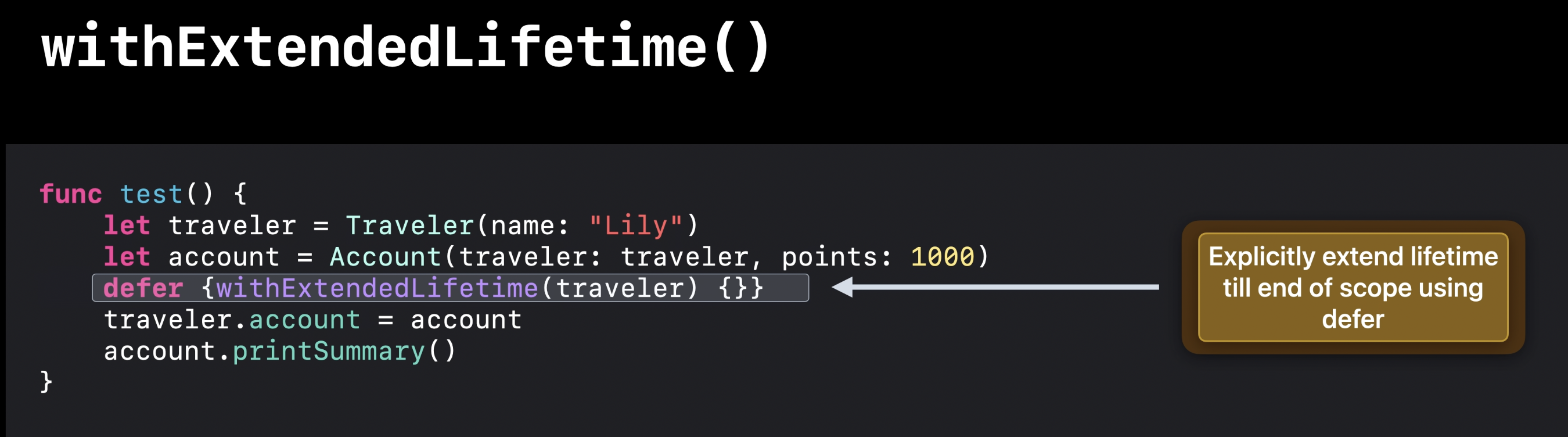Swift는 withExtendedLifetime() 라는 객체의 수명을 명시적으로 연장할 수 있는 유틸리티를 제공한다.