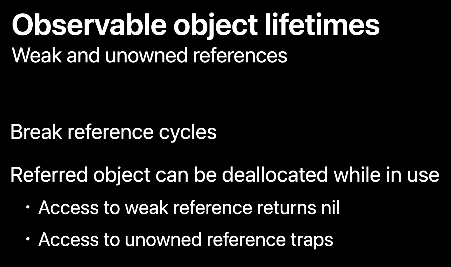하지만 'weak' 이나 'unowned' 및 'deinitializer' 의 sideeffects 들은 객체의 수명주기를 고려해야 한다.