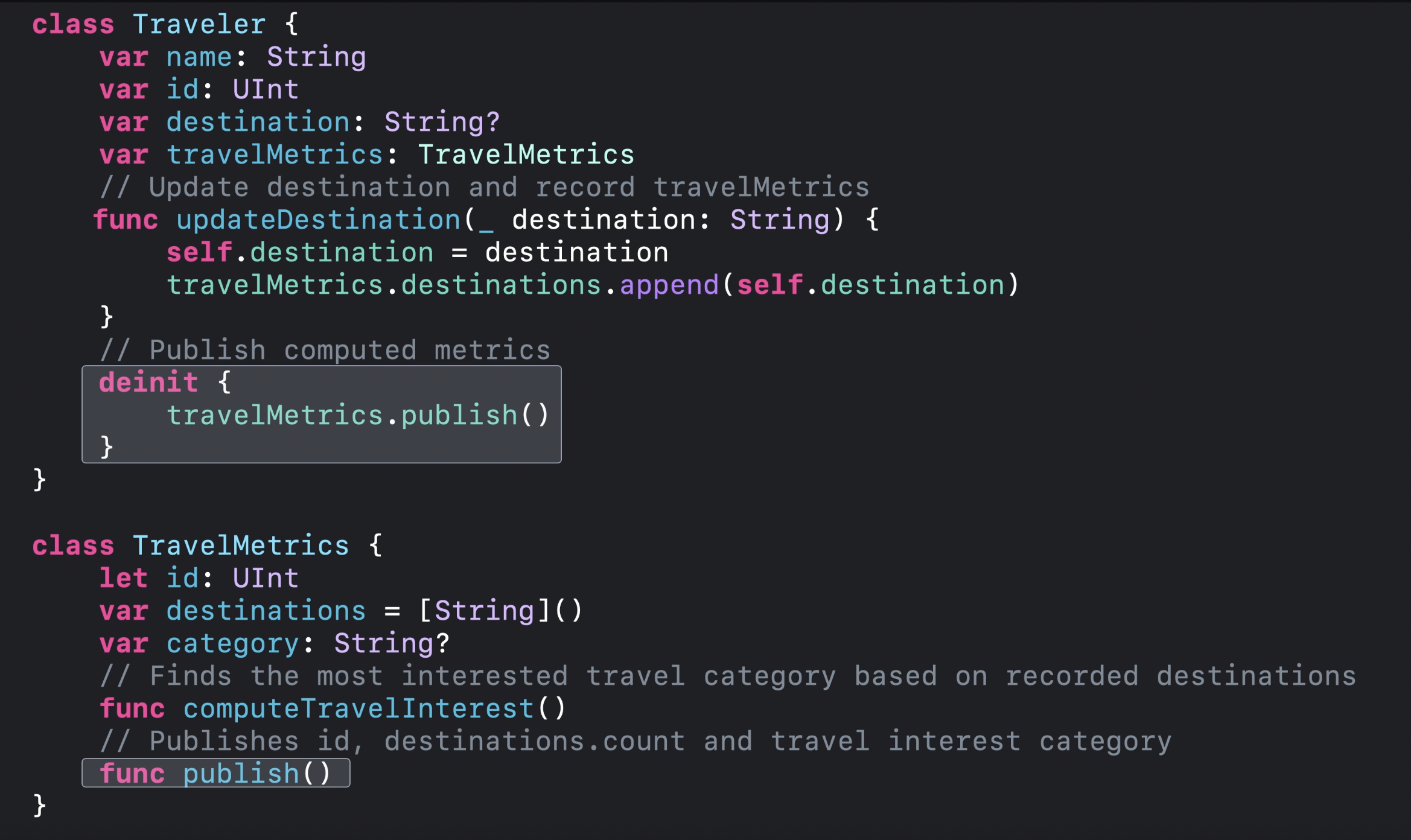 'Traveler' 객체가 deinit() 될 때, 'TravelMetrics' 객체의 publish() 를 호출한다.