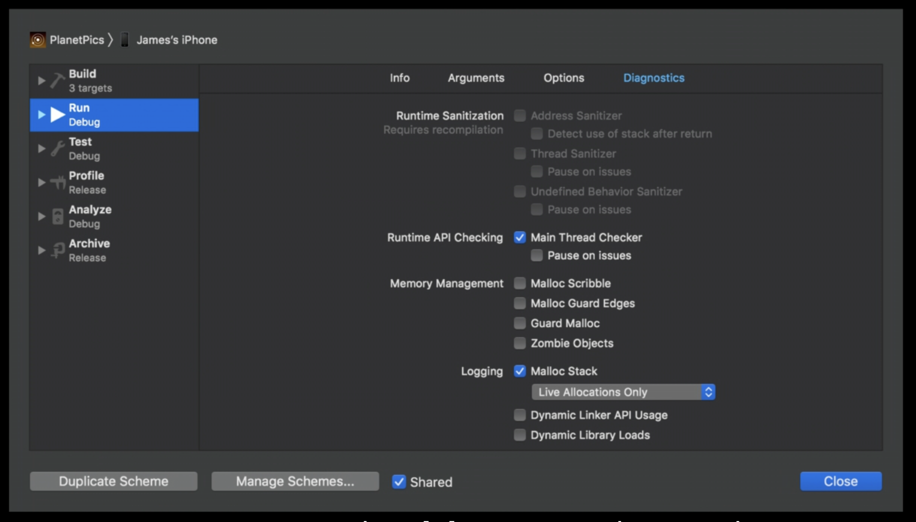 따라서 'malloc stack logging' 을 활성화하면, 각 메모리 할당에 대한 백트레이스가 기록된다.