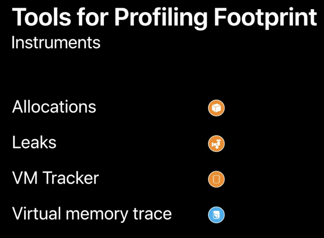 메모리 프로파일링에 탁월한 도구로, 앱의 'Dirty' 및 'Compressed '메모리 사용량에 대한 정보를 제공한다.