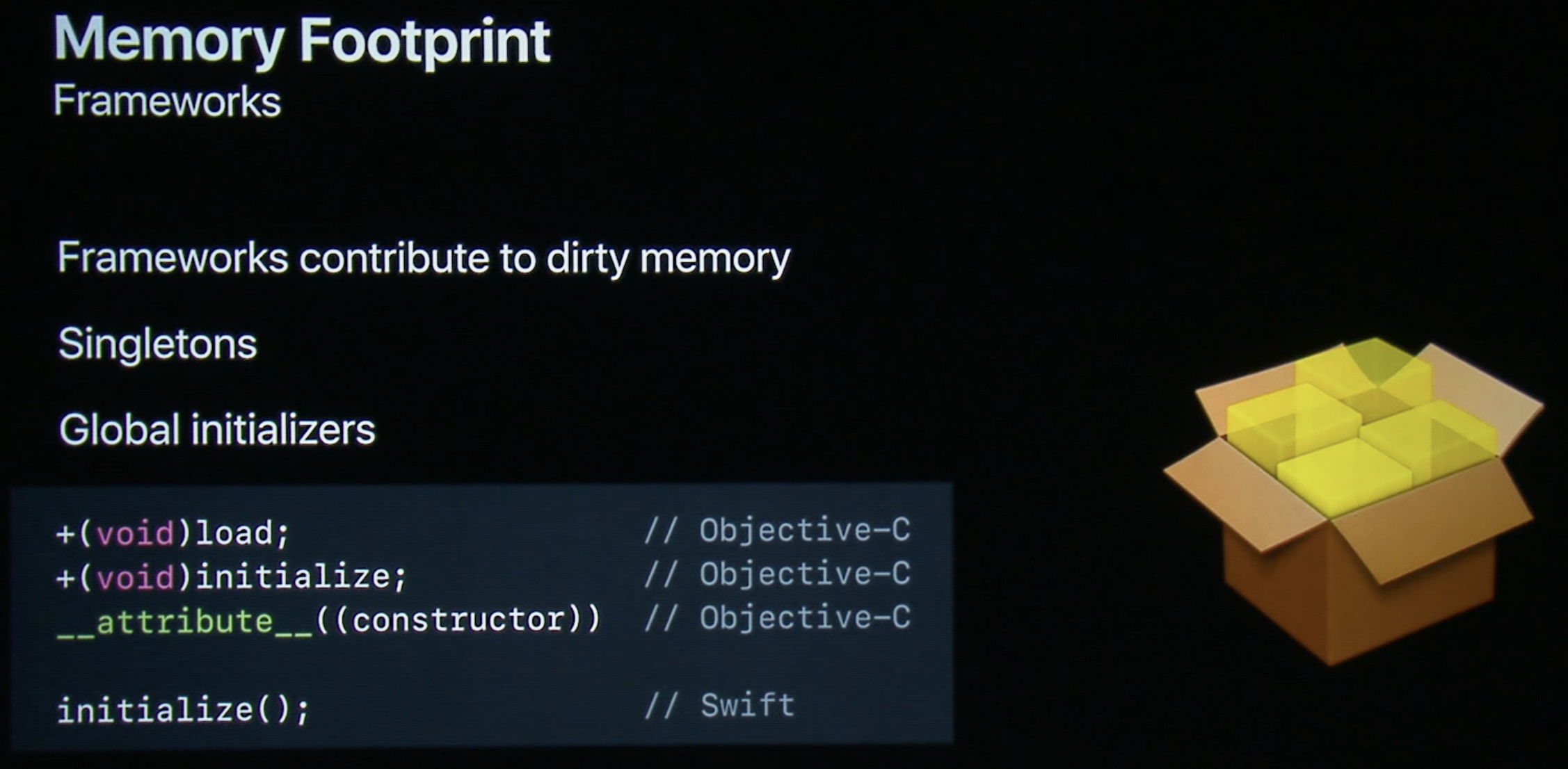 하지만 자신이 유지하는 프레임워크의 경우, 싱글턴 패턴이나, 'global initializers' 를 사용하면 'Dirty' 메모리 사용량을 줄일 수 있다. 싱글턴 객체는 한번 생성되면 항상 메모리에 올라와 있으며, 'global initializers' 는 프레임워크가 연결되거나 클래스가 로드될 때 실행된다.