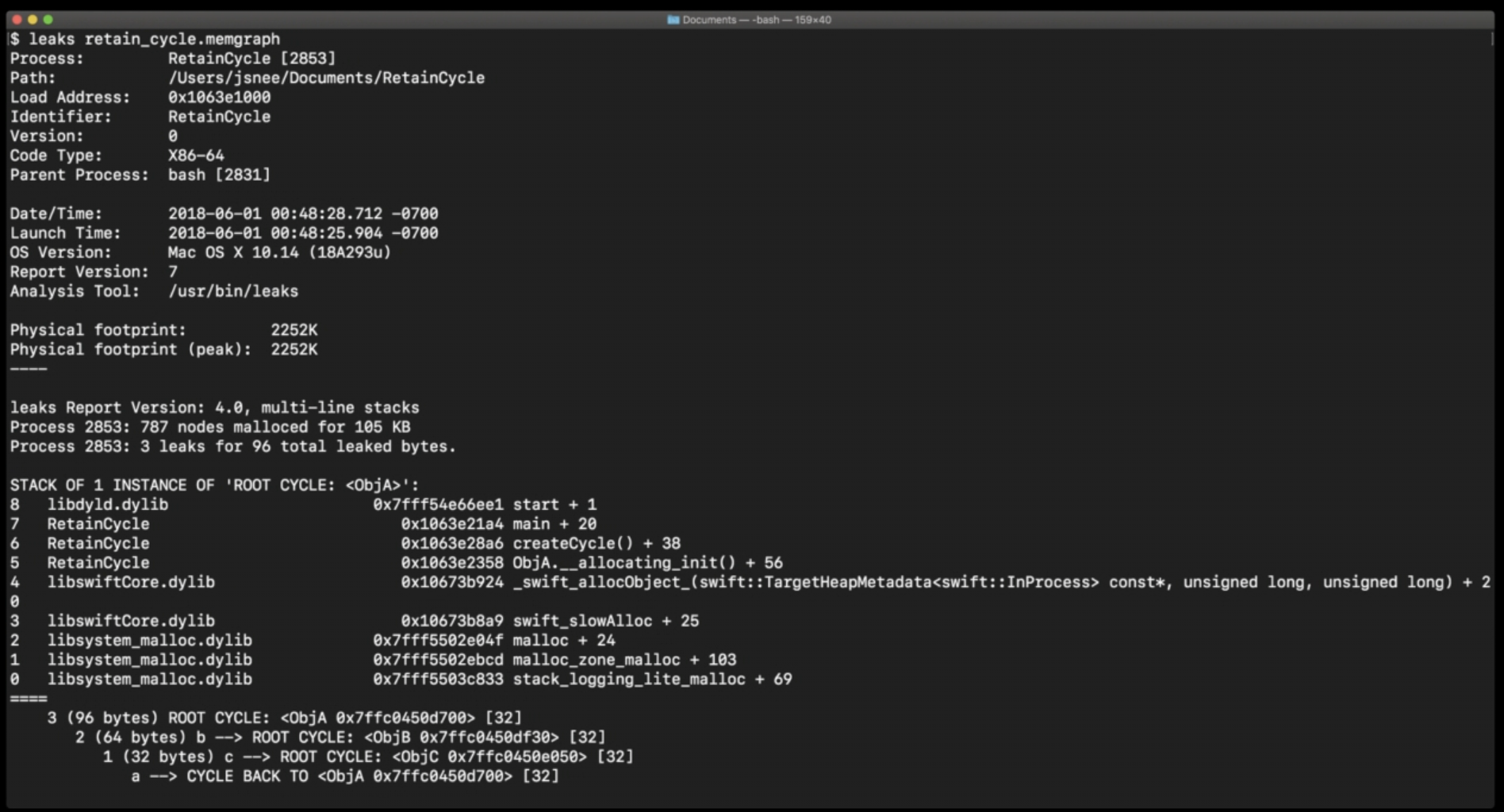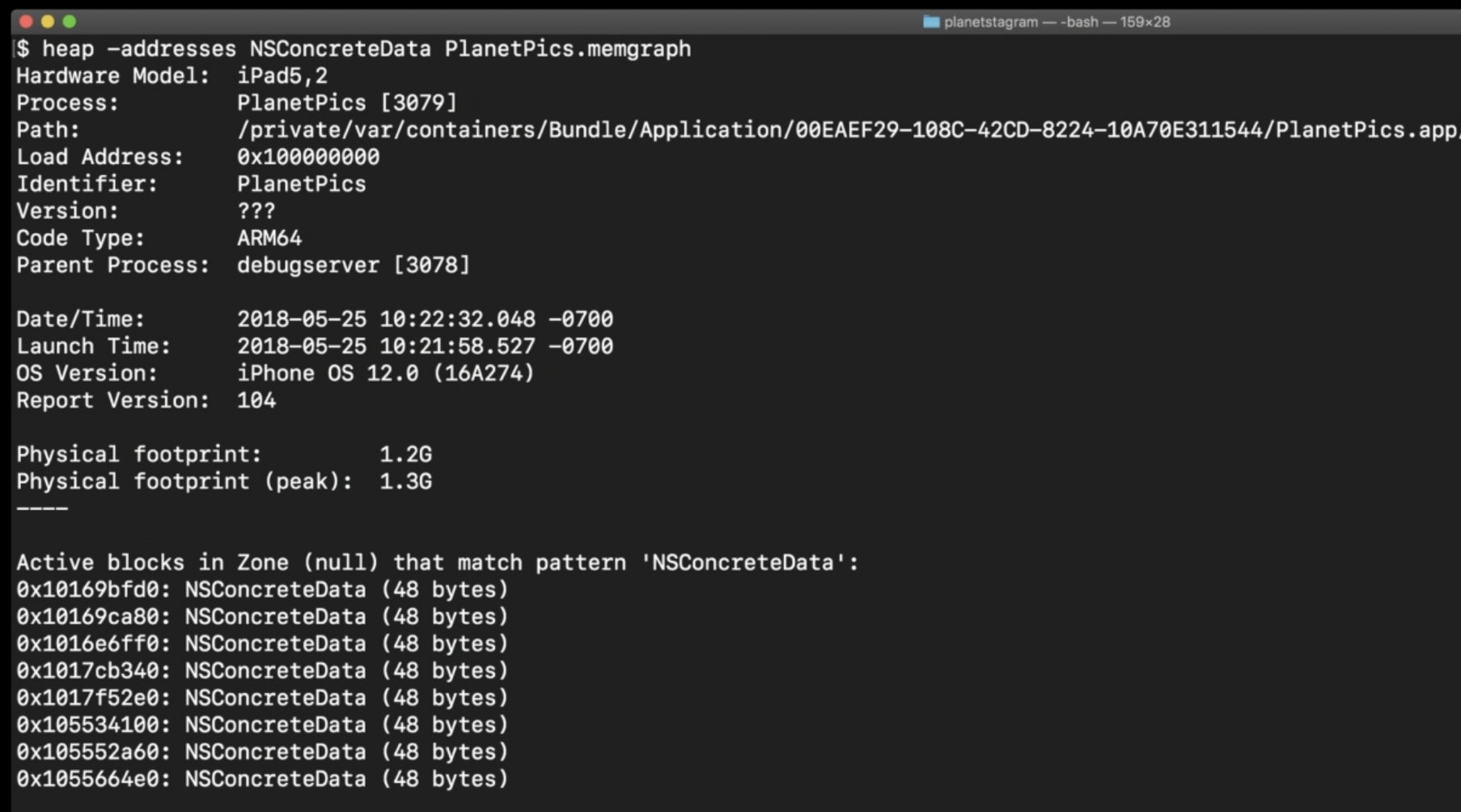 주어진 'NSConcreteData' 객체에 대한 주소를 'malloc history' 툴에 전달하여 어디서 그 객체가 생성되었는지를 백트레이스를 통해 확인했다.