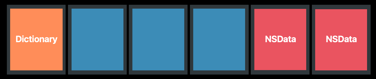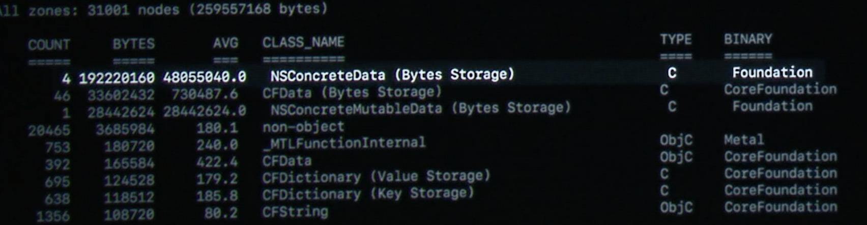 우리는 이제 거대한 'NSConcreteData' 객체들을 확인할 수 있다.