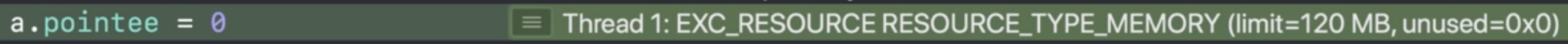 앱이 메모리 사용량의 한계를 넘어서면, Xcode는 이러한 예외를 잡아내고 앱을 일시 중지시킨다.