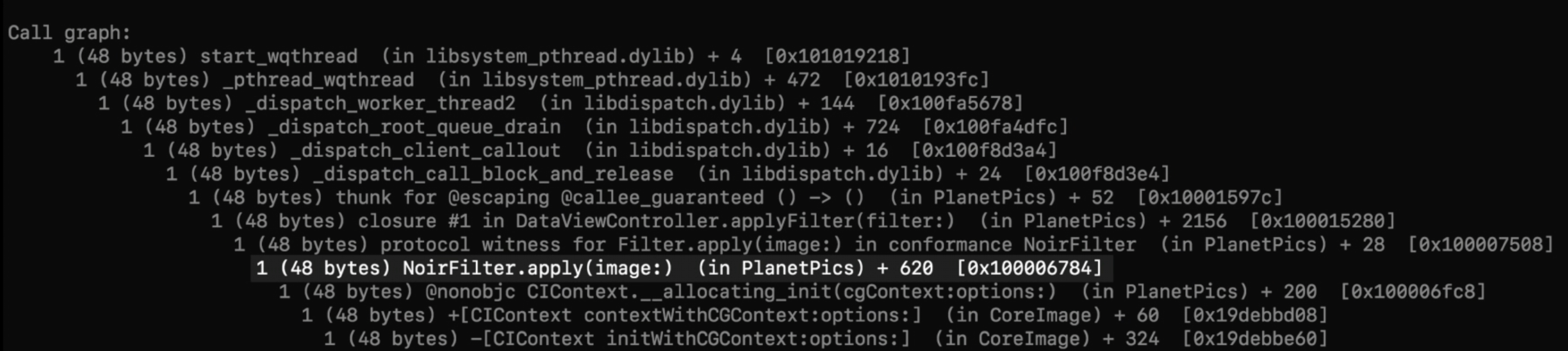 백트레이스 결과, 'noirfilter' 의 'apply' 메서드가 거대한 'NSData' 를 생성하고 있음을 알 수 있었다.