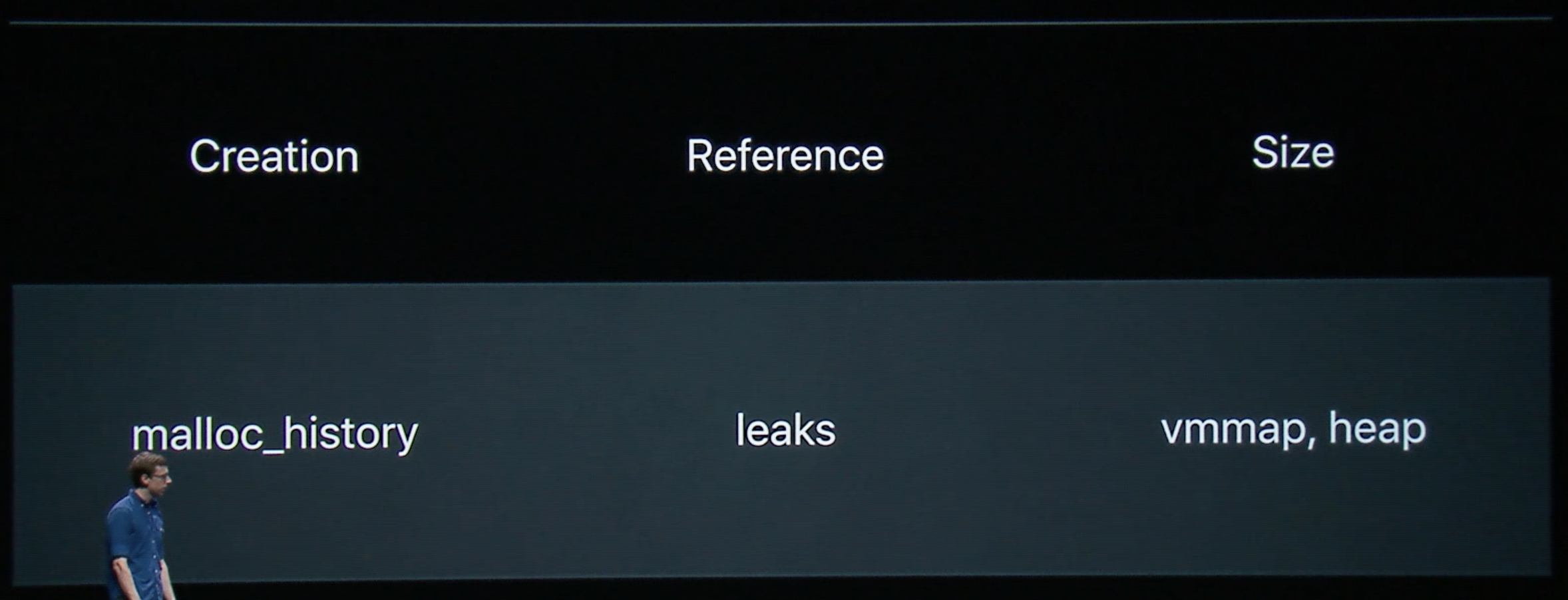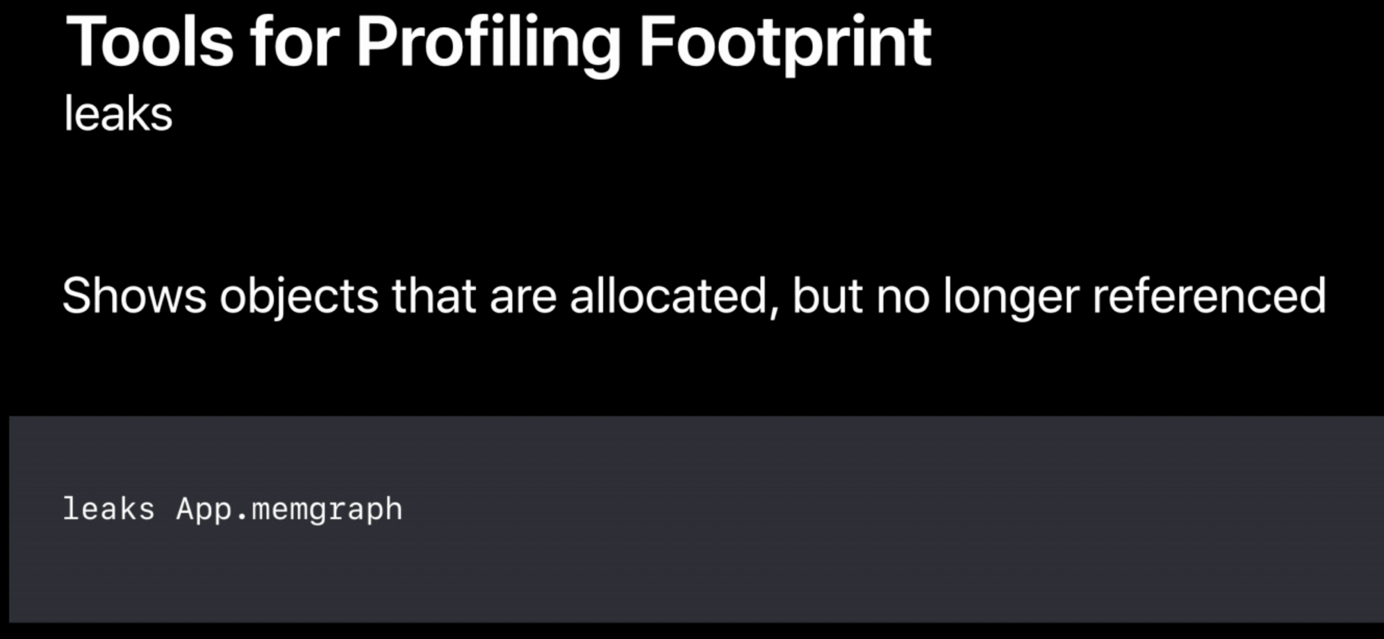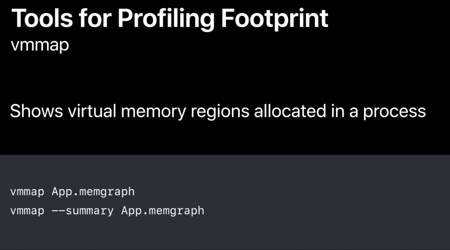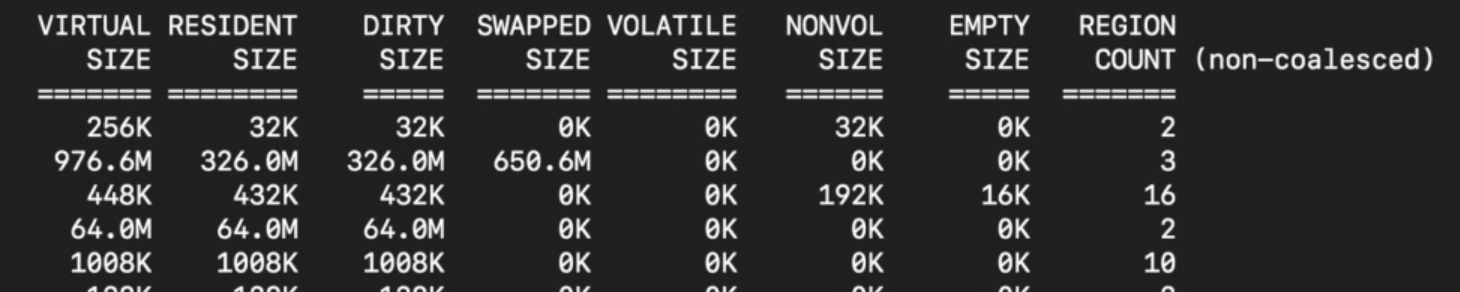 시작점으로서, 프로세스의 'memgraph' 에 대해 'summary flag'와 함께 'vmmap' 을 실행하는 것을 추천한다.