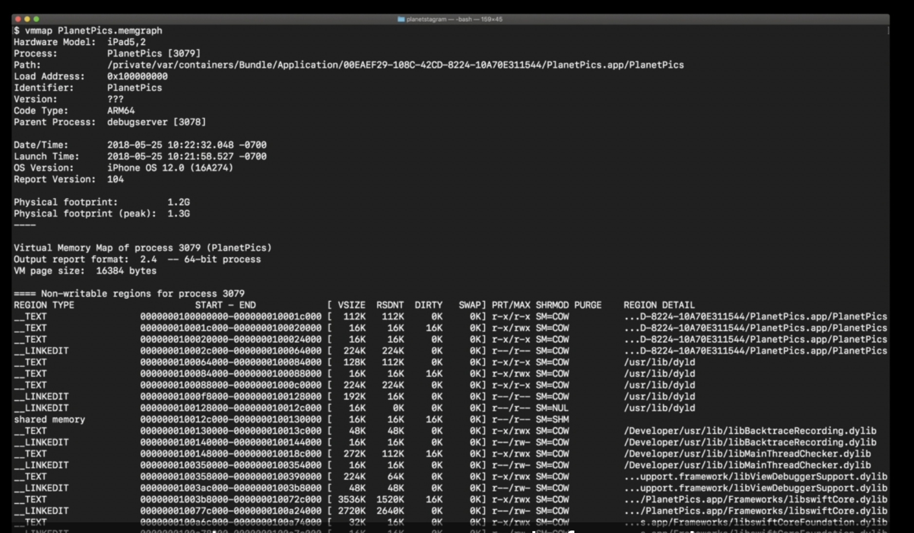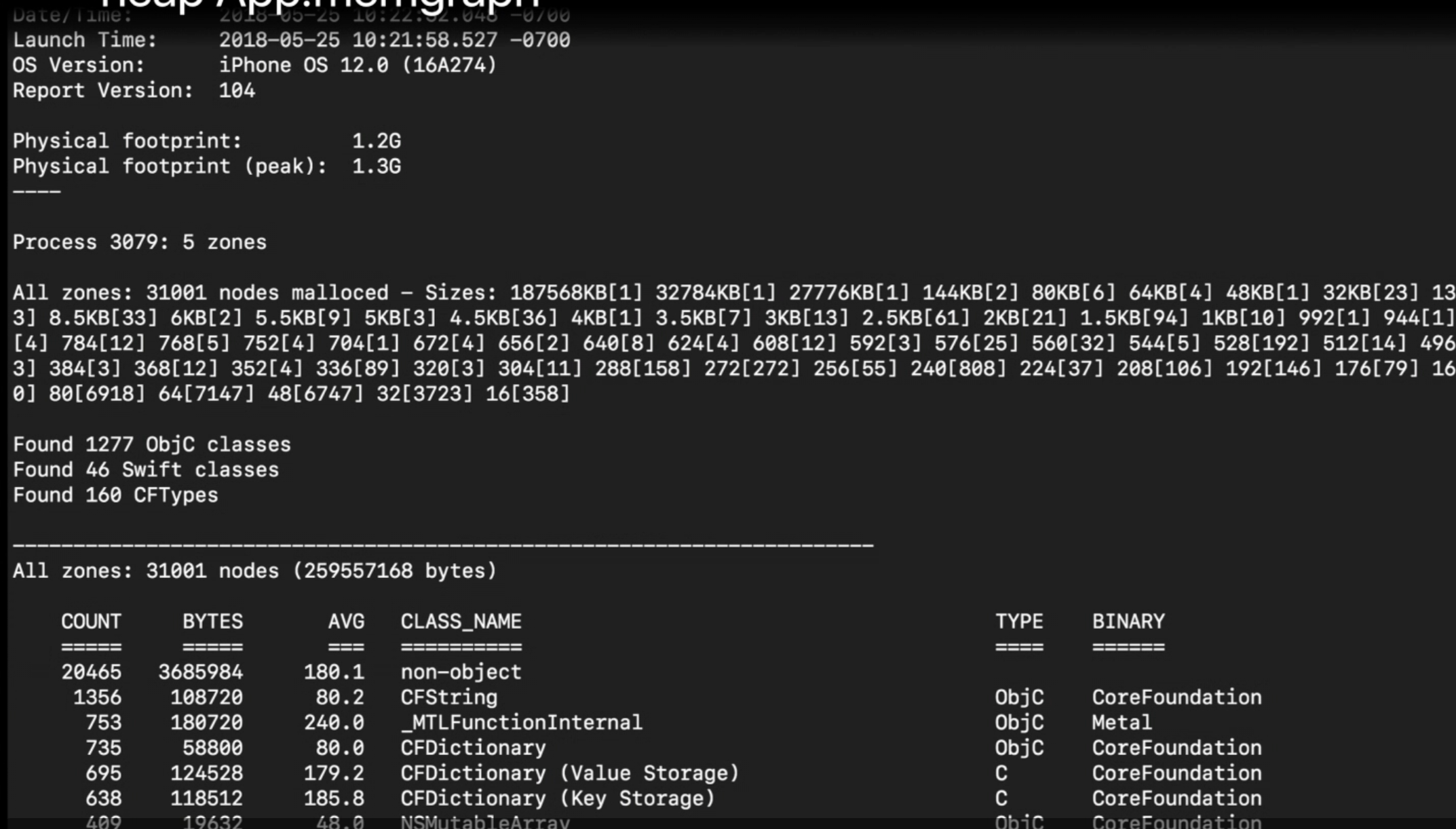 Xcode가 'memory resource exception' 을 발견했을 때, 찍은 'memgraph' 가 있고, 이를 사용하여 힙을 조사하고자 한다. 그래서 'memgraph' 를 'heap'에 전달하였고, 이 도구는 각 객체의 클래스 이름, 그 객체의 수, 그리고 그 객체들의 평균 크기와 해당 클래스의 객체 전체 크기에 대한 정보를 제공한다.