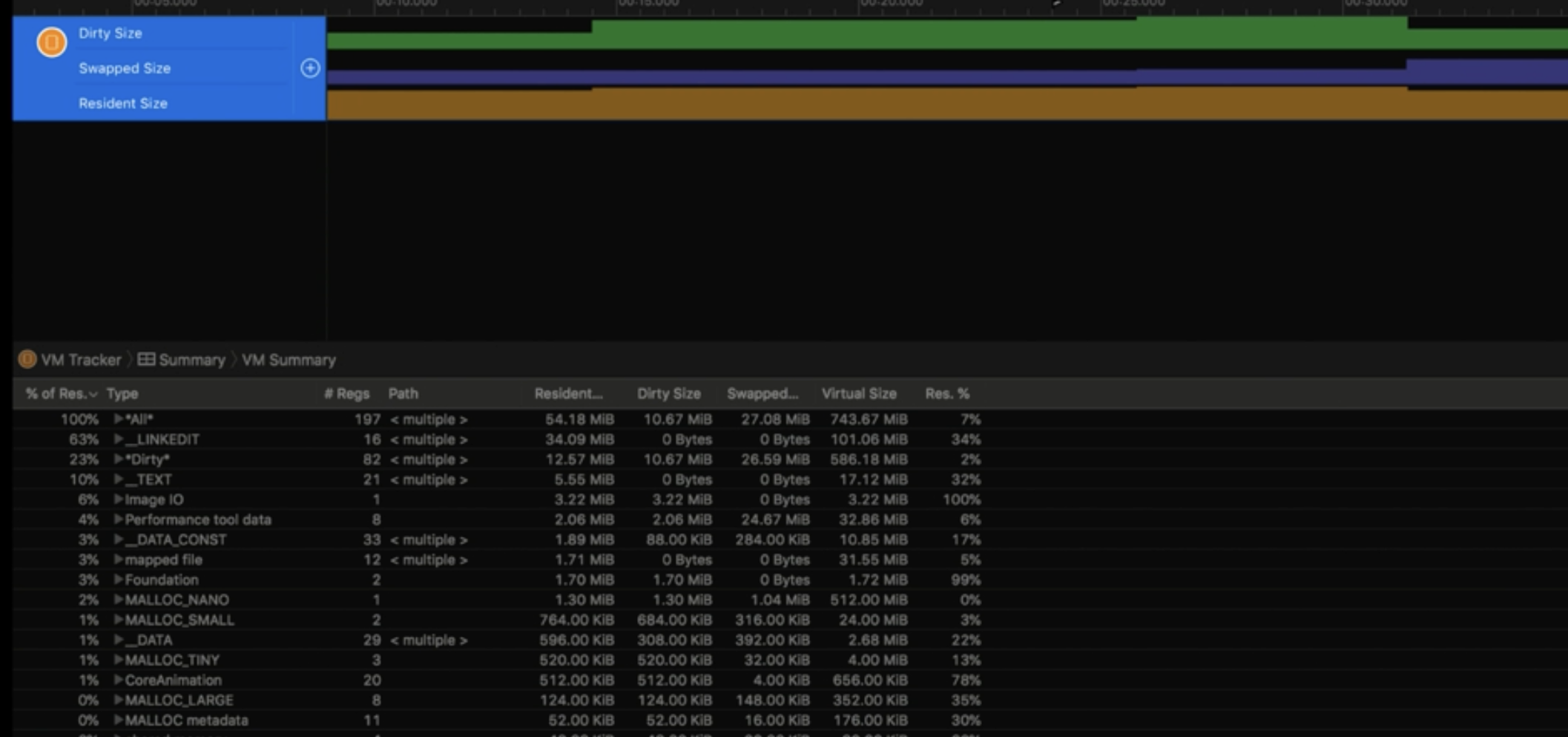이 도구는 'Dirty' 메모리와 'Swap(iOS에서 Compressed 메모리를 의미함.)' 메모리에 대해 분리된 트랙을 제공하고, resident size(실제로 메모리에 올라와 있는 크기)에 대한 정보를 제공한다.