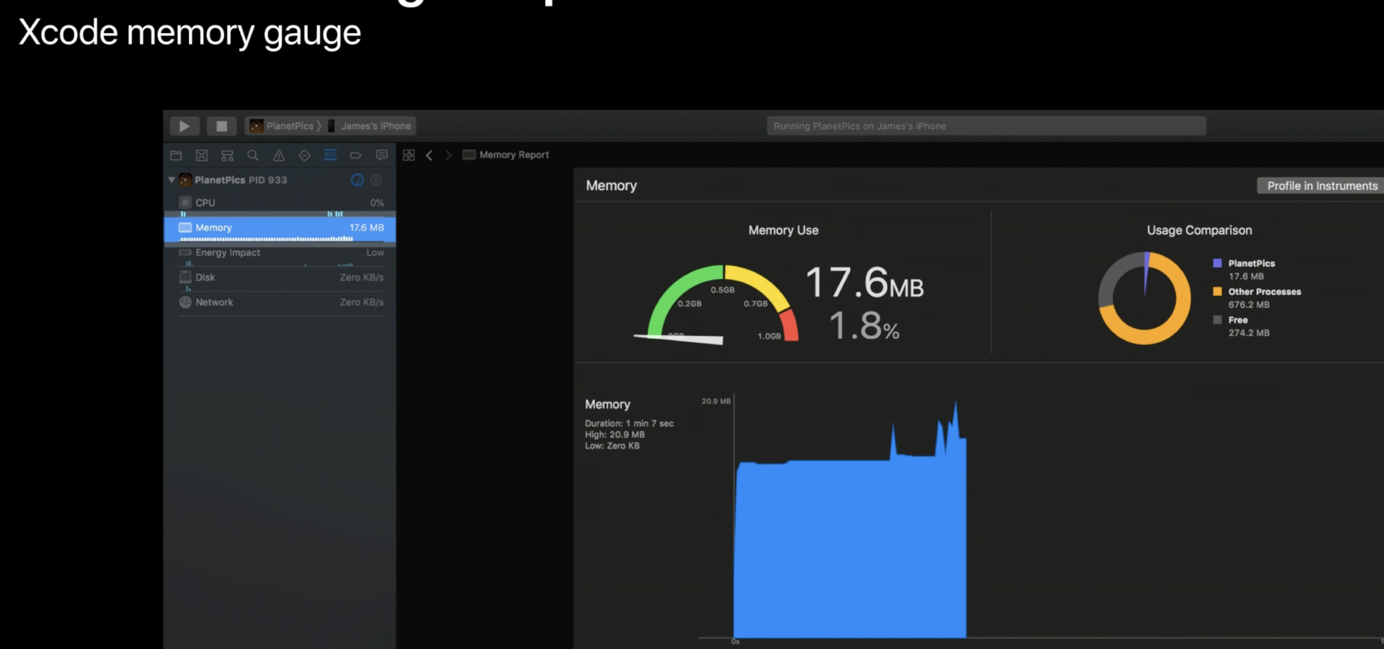 Xcode의 디버그 네비게이터에 표시되는 메모리 게이지는 앱의 메모리 사용량을 빠르게 확인할 수 있는 좋은 방법이다.