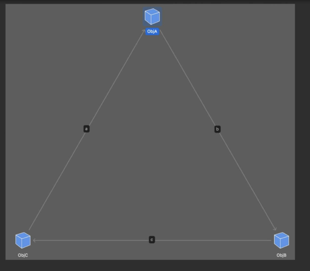 세 개의 객체가 모두 서로를 강하게 참조하여, 순환 참조를 만드는 경우이다.