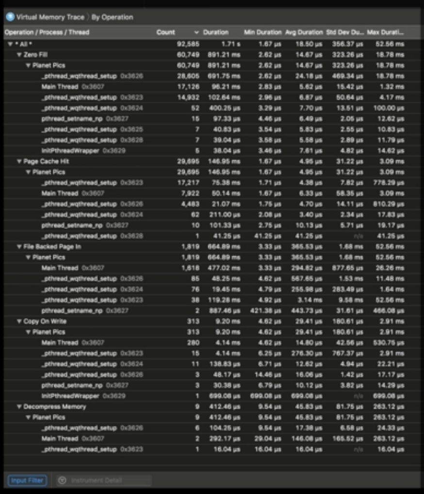 VM Memory Trace는 앱과 관련하여 가상 메모리 시스템의 성능을 깊게 보여준다.