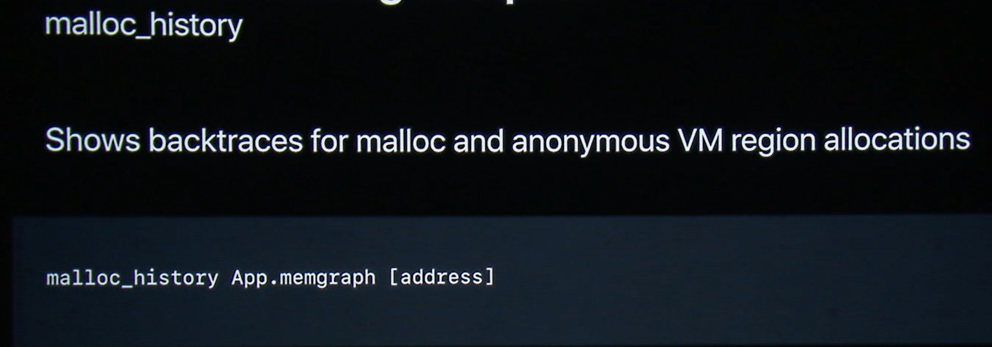 더불어 만약 'malloc stack logging(메모리 할당 스택 로깅)' 이 프로세스에서 활성화되어 있다면, 루트 노드에 대한 백트레이스(함수 호출의 역추적 정보)까지 제공해준다.