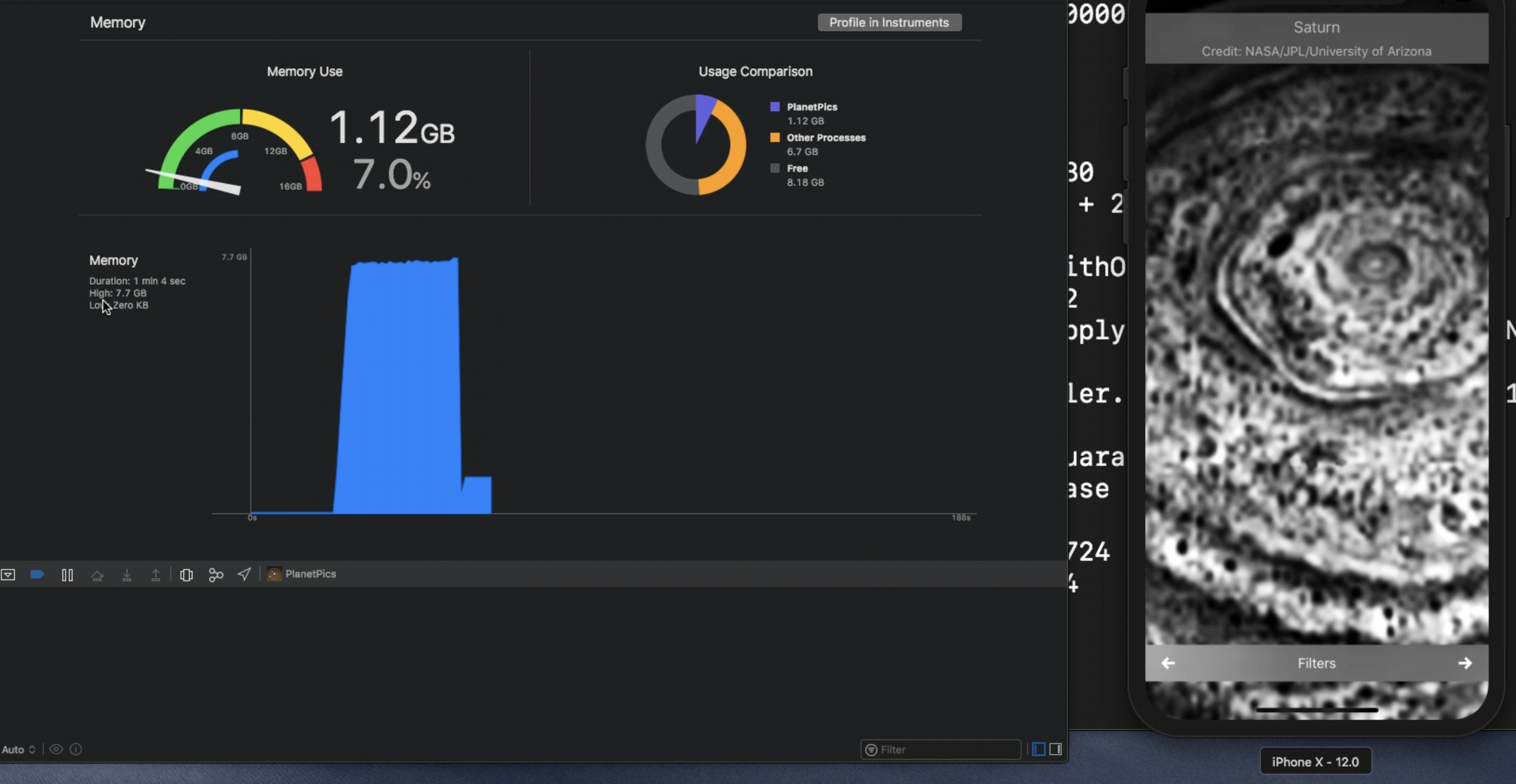 이를 통해 앱에서 7.7GB의 메모리를 사용하는 주범이 이미지 크기라는 것을 확신할 수 있다.