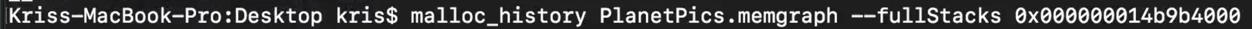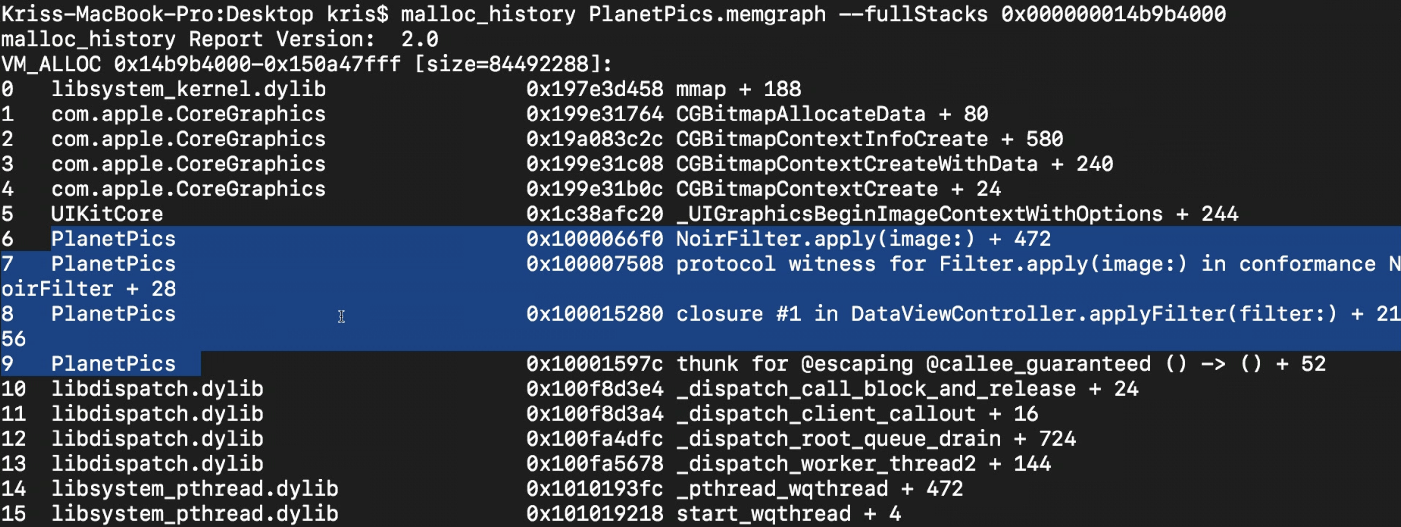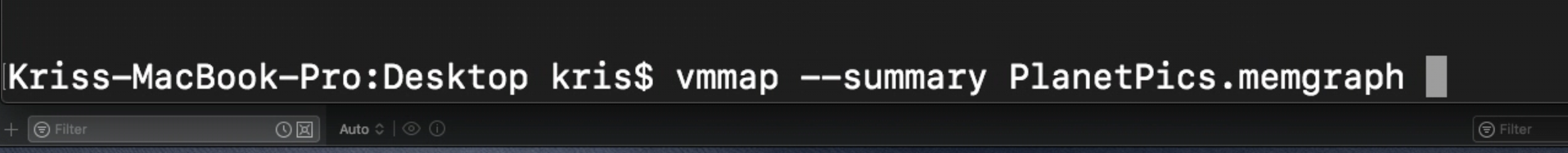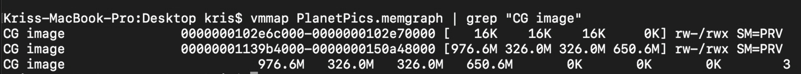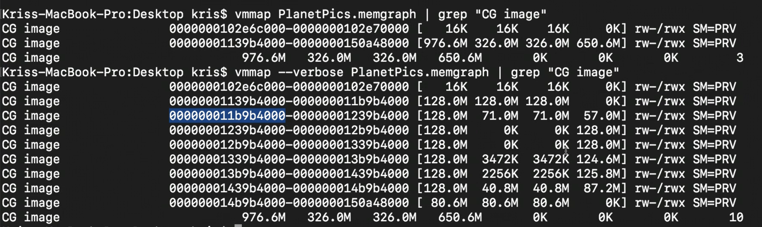 'vmmap --verbose PlanetPics.memgraph | grep "CG image"'