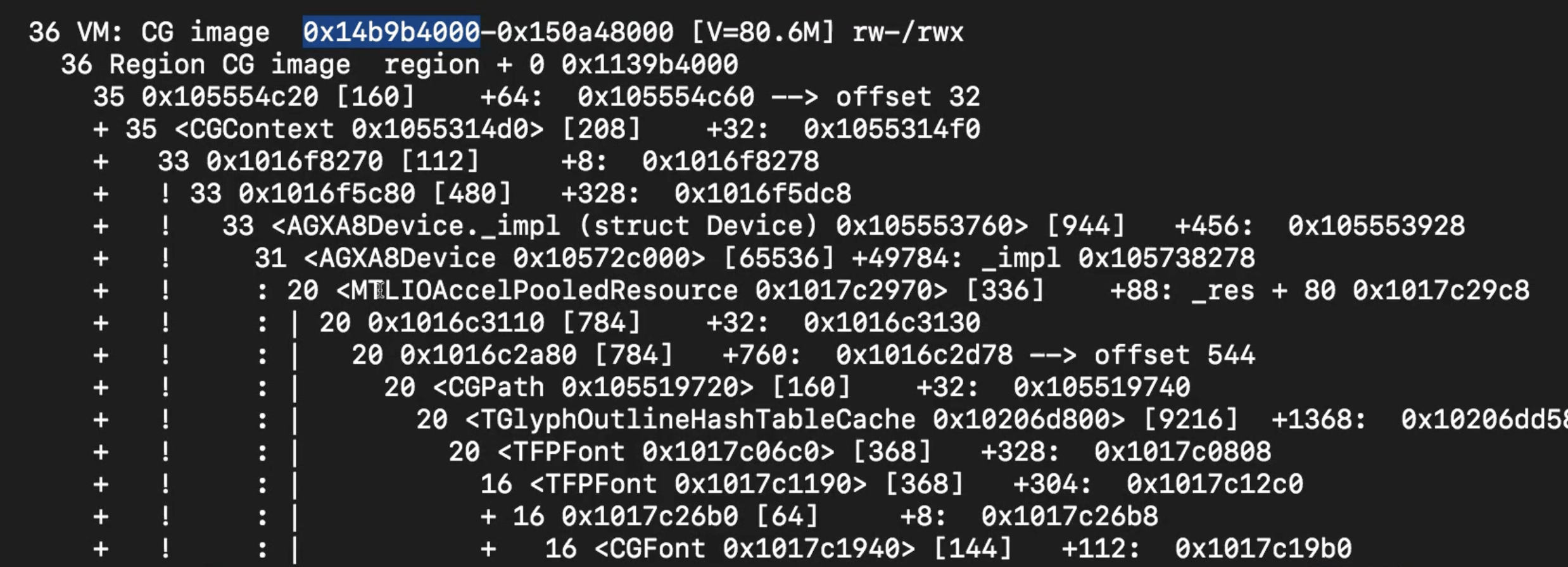 분석을 더 확실하게 하기 위해 CGImage의 vm 영역 목록의 아래에서 2번째에 있는 주소(방금 확인한 끝 주소의 위에 위치)를 살펴보자.