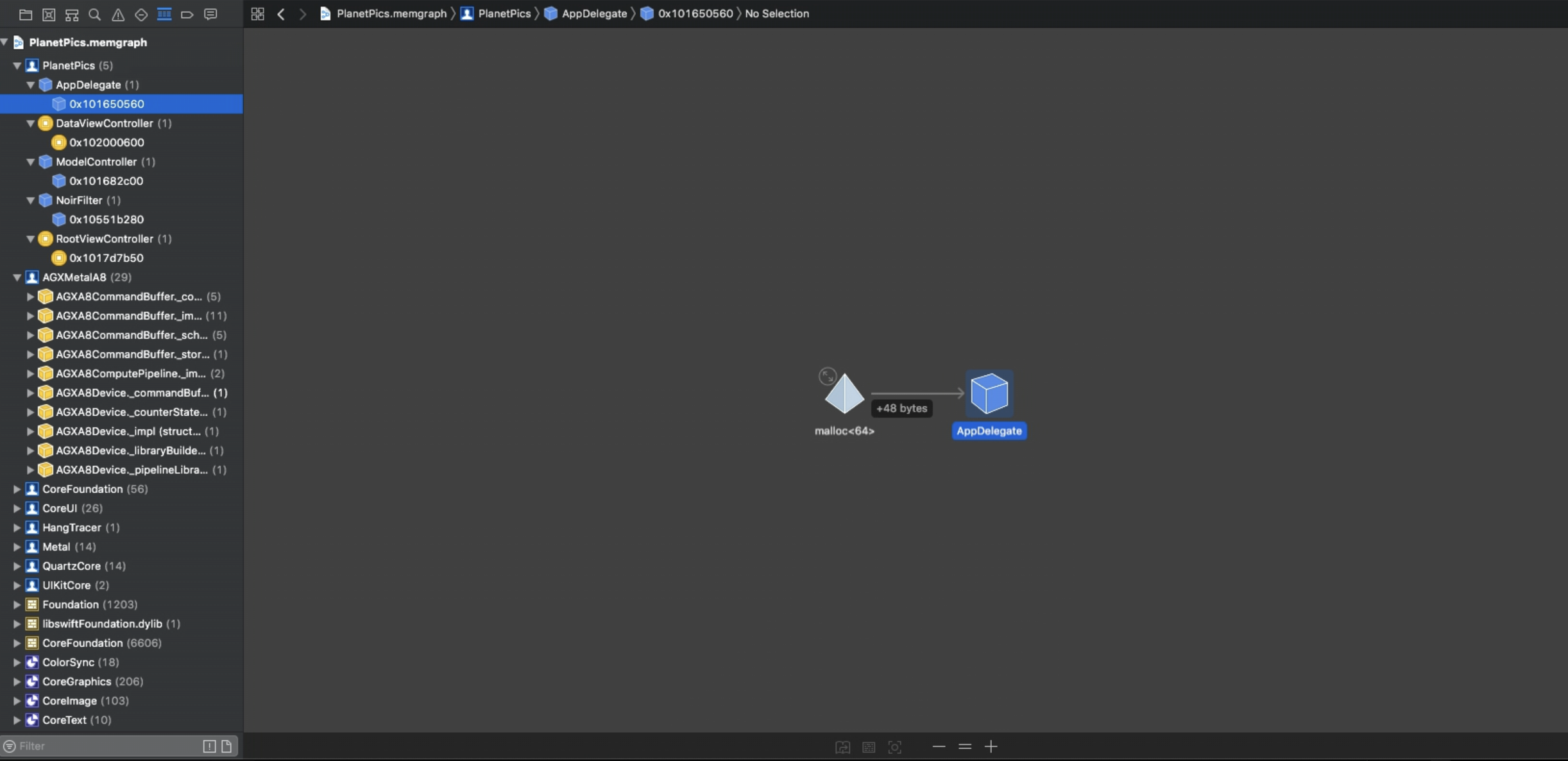 위 사진을 보면 여러 뷰컨트롤러와 'NoirFilter'가 메모리에 존재하는 것을 확인할 수 있다.