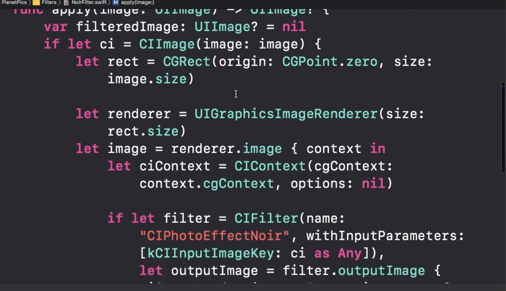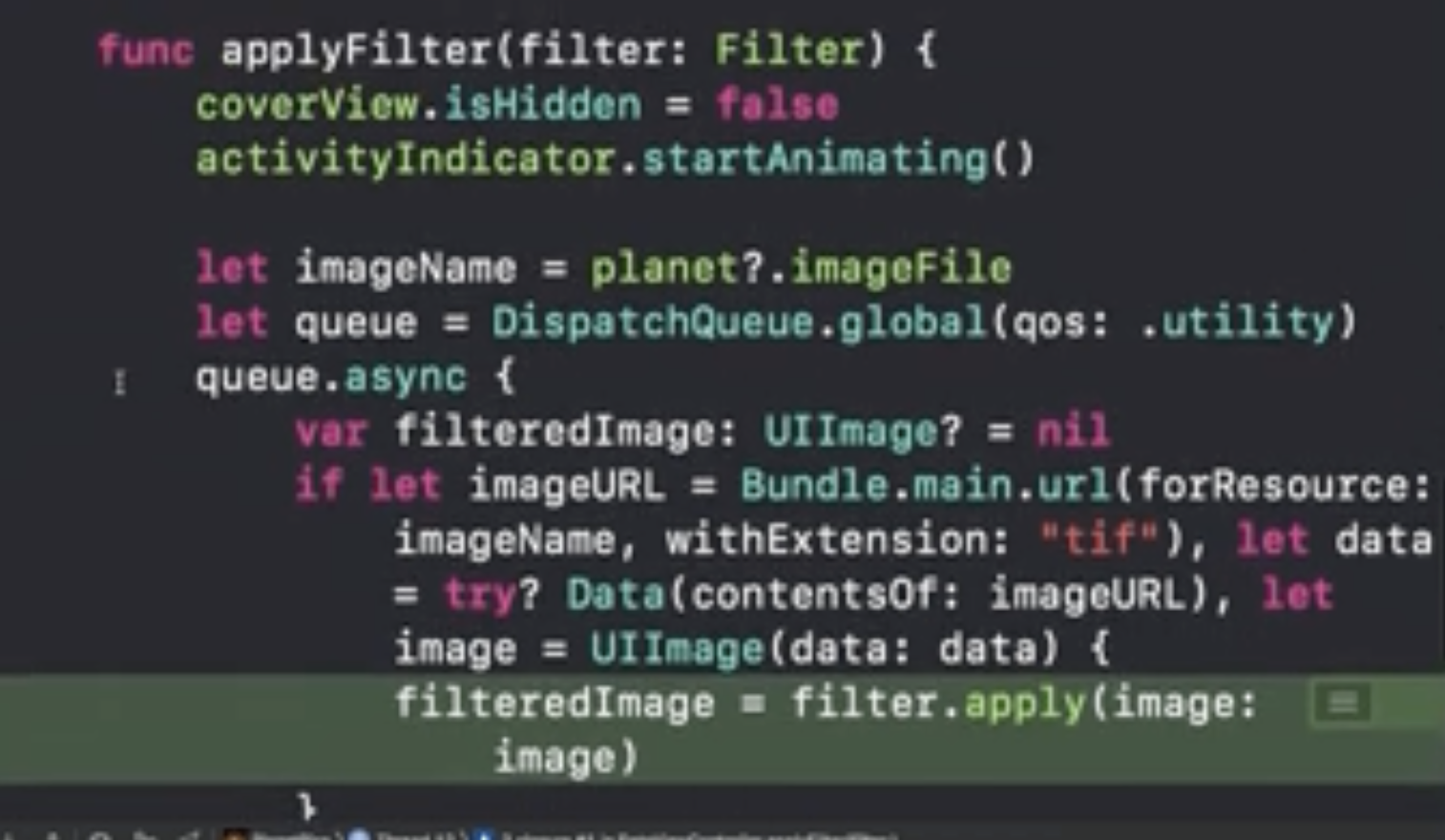 코드는 번들로부터 URL을 가져오고, 해당 URL에서 데이터를 로드하여 UIImage로 변환한 뒤 필터로 전달하는 방식이다.