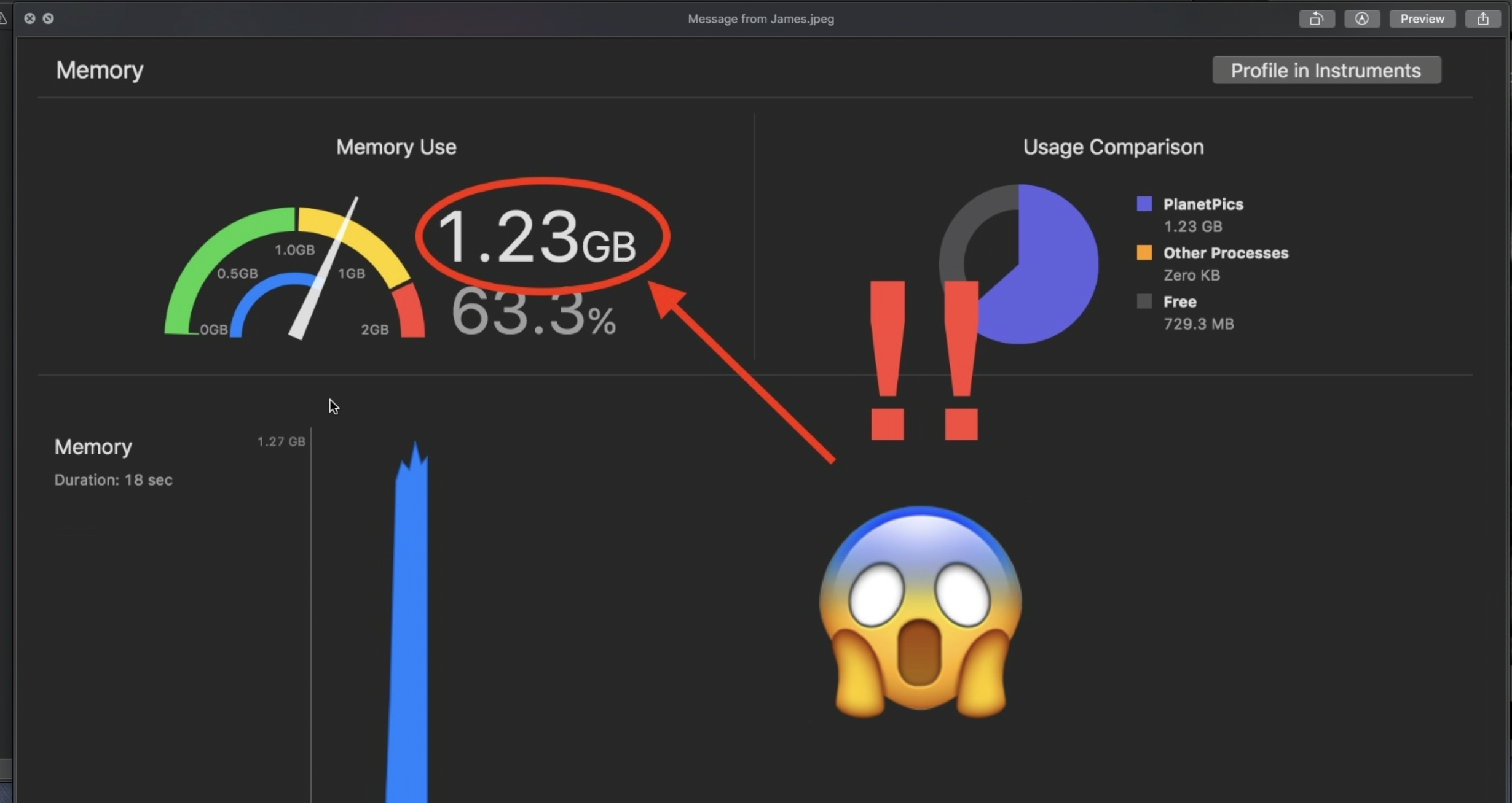 근데 James가 앱의 메모리 사용량을 분석한 결과를 보여주었다. 위 사진이다.