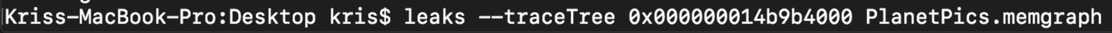 따라서 'leaks'를 사용하여 분석을 진행한다. 위 명령 코드를 보면 'traceTree' flag를 사용하여 우리가 분석하기로 했던 마지막 주소를 전달하는데, 이를 통해 해당 주소에 대한 참조를 트리 구조로 볼 수 있다. 이 트리 구조를 통해 해당 가상 메모리 영역을 참조하는 것들과 그들 사이의 관계를 살펴볼 수 있다.