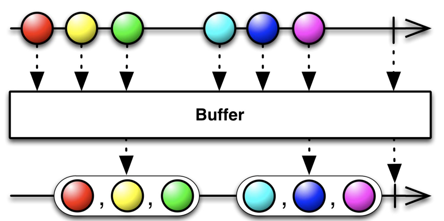 buffer 연산자를 사용하면, 빈번한 이벤트를 그룹화하고 일정 시간 간격으로 이벤트 그룹을 처리하도록 Observable을 생성할 수 있다. 이를 통해 각 이벤트를 즉시 처리하는 대신, 일정 수준에 도달하면 처리를 시작하도록 한다.