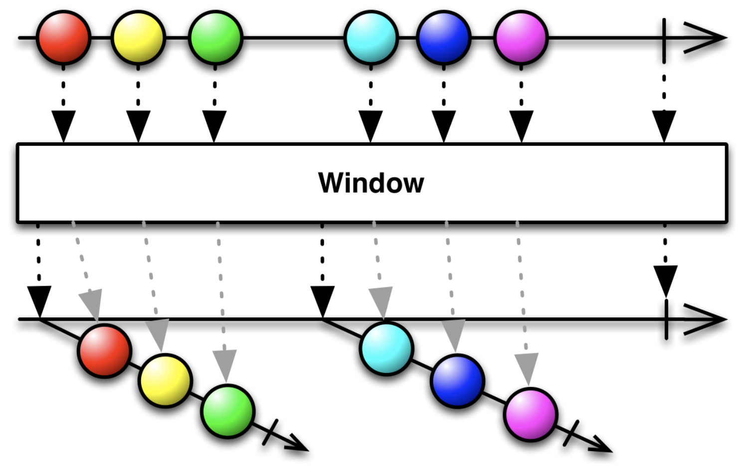 window 연산자는 Observable이 방출하는 데이터를 일정 시간 동안의 그룹(window)으로 나눌 수 있다. 각 window는 새로운 Observable이며, 이 Observable은 window에서 설정된 동안에 원본 Observable이 방출하는 데이터를 방출한다.