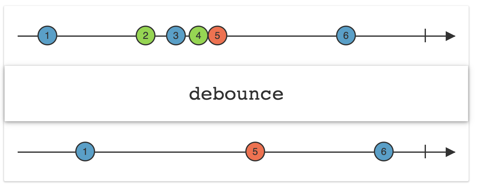 따라서 'dueTime' 만큼의 시간 동안 이벤트가 발생하면, 새로운 이벤트를 예약하는 작업과 이전에 예약된 이벤트를 갈아치우는 작업을 수행하고, 'dueTime' 만큼의 시간 동안 아무 이벤트가 발생하지 않으면, 예약된 가장 최신의 이벤트가 수행되는 것이다.