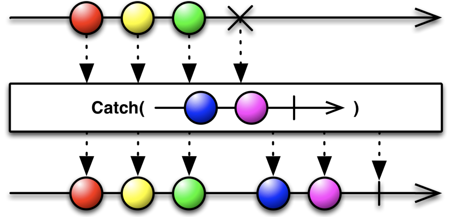 원본 Observable에서 .onError 이벤트를 방출했을 경우, 'catchError' 가 이를 캐치하여 새로운 Observable을 생성하고 반환한다.