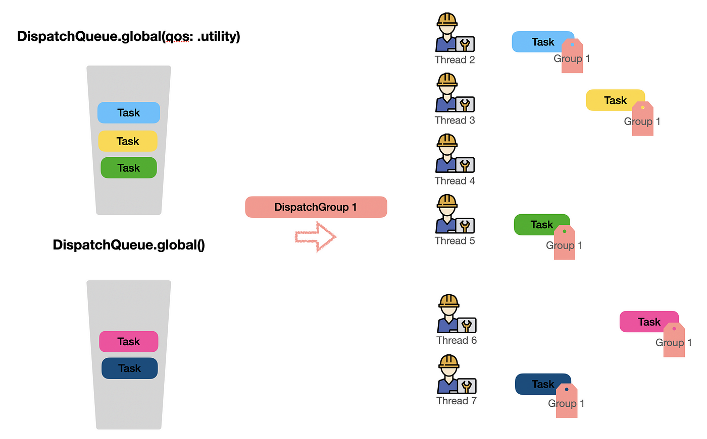 - 원하는 작업을 DispatchQueue에 넣어주면, 알아서 필요한 스레드를 생성하여 작업을 분산 처리함