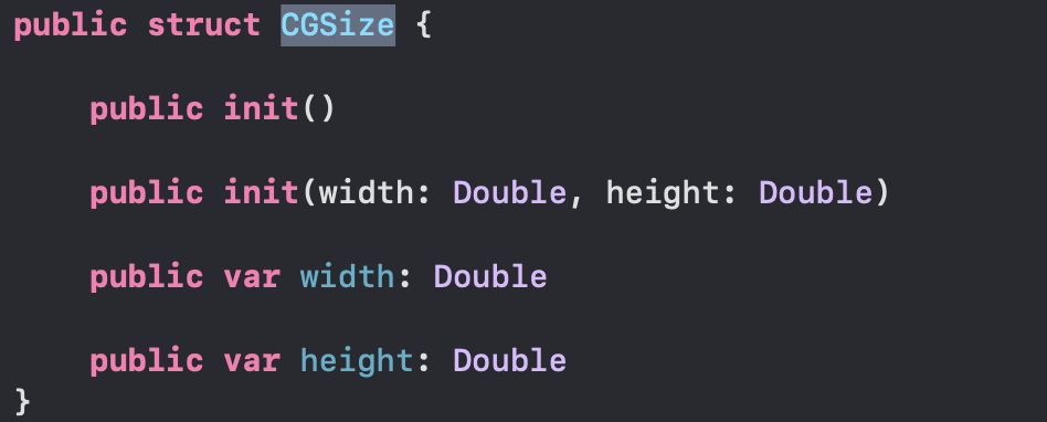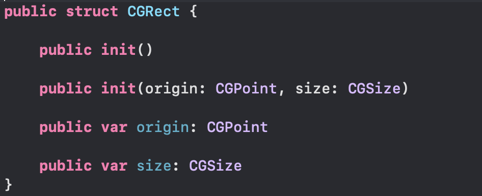 -데피니션을 보면 origin(위치)는 CGPoint, size(크기)는 CGSize로 정의되어 있는 걸 알 수 있다.