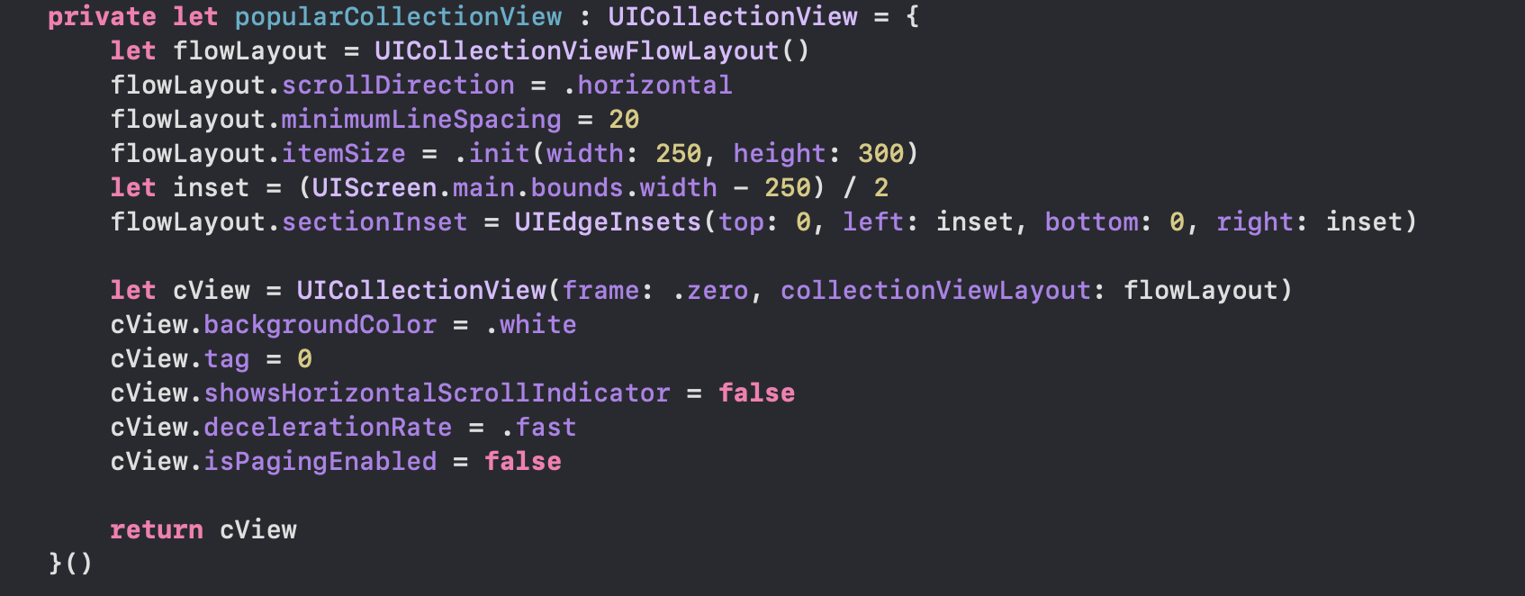 1) 컬렉션 뷰 안의 inset을 설정해주는 것으로, cell을 가운데에 위치시키기 위해 left, right 각 inset을 넣어주세요.