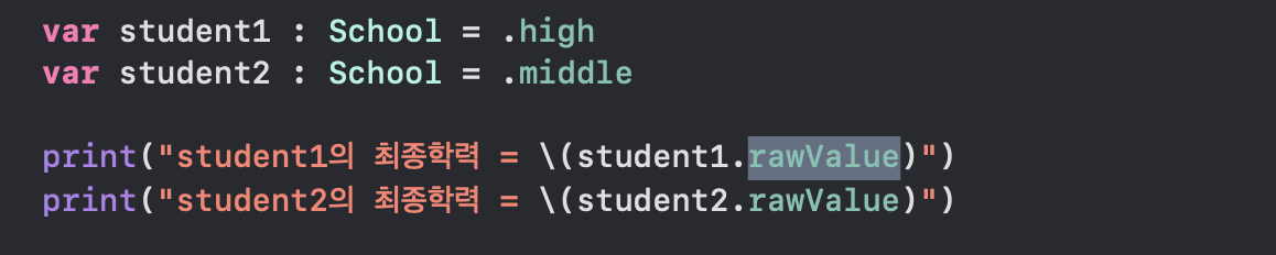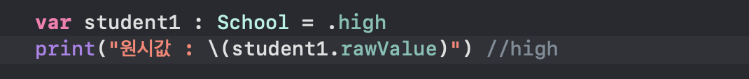 원시값에 접근하려면 항목을 선언하고 .rawValue 프로퍼티를 통해 접근할 수 있다.
